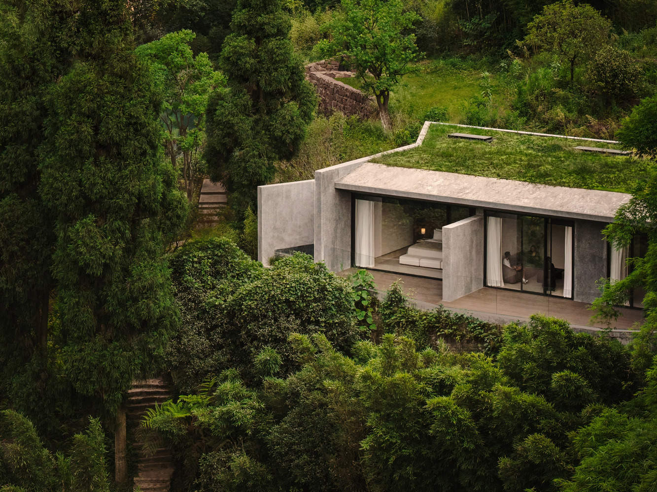 位于场地最高点的客房,立面覆以质朴的水洗石,树木掩映下,远观几乎隐于山林;推门而入,整面落地窗将宁静山峦尽收眼底,框景于山,如同一幅展开的山水画,营造出沉浸的观景体验。