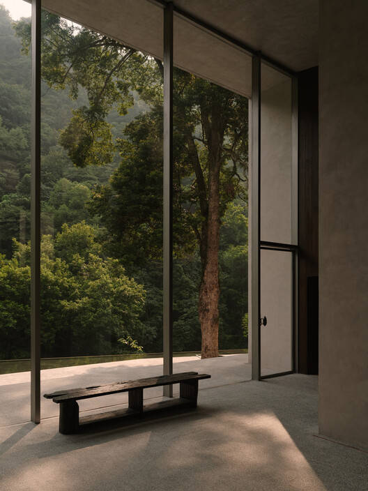 Spiritual Space · Boundaryless Realm: The large floor-to-ceiling windows in the spiritual space dissolve the boundaries between indoor and outdoor, drawing the natural landscape inside. Here, people engage in an immersive dialogue with the forest, feeling the rhythm of the surrounding nature in an atmosphere that is both serene and open.