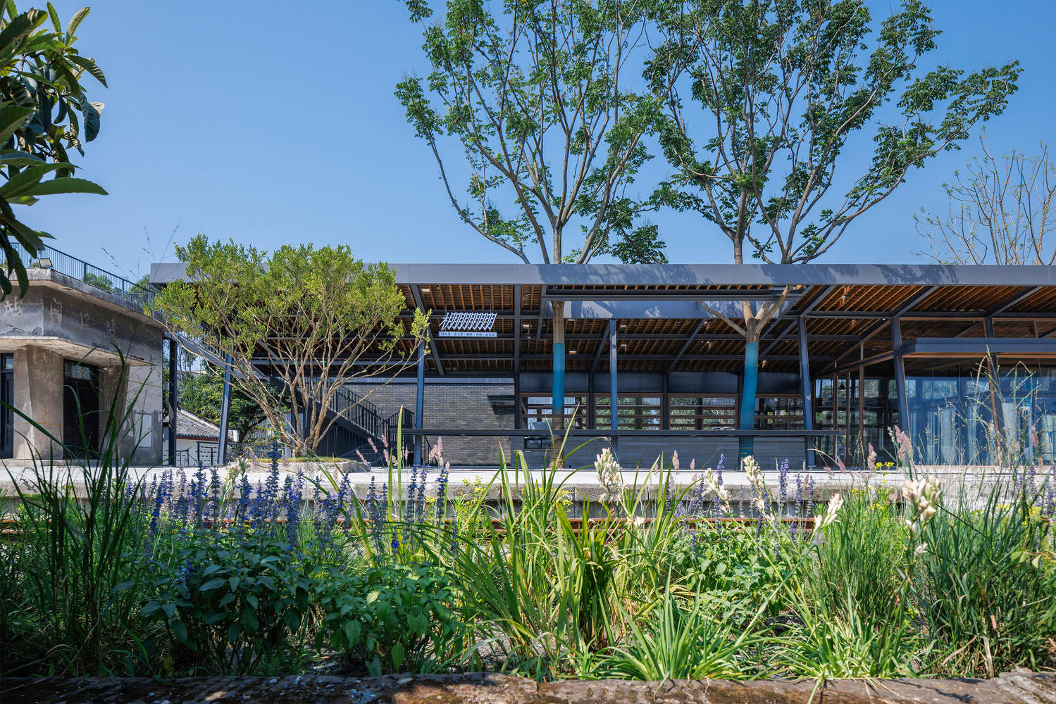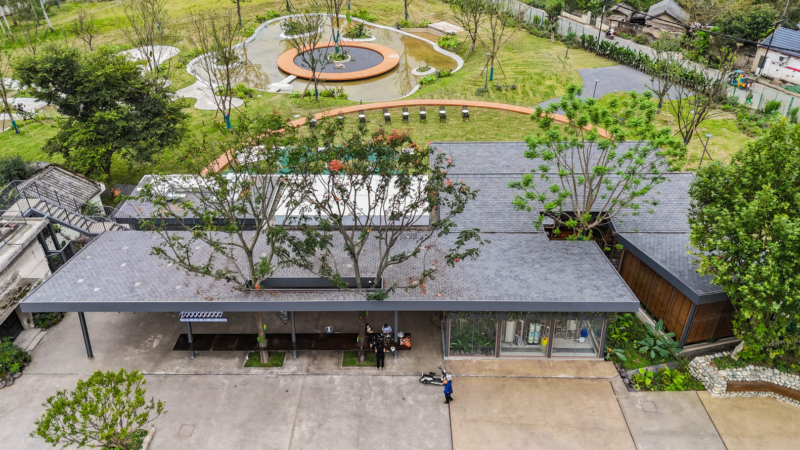 结构创新与材料的诗意表达:建筑设计在结构语言上展现了精湛的平衡与张力。轻质钢结构的使用和倾斜钢柱的布局,不仅塑造了轻盈通透的“棚棚儿”形象,也巧妙地体现了地域习俗与现代构造的融合。特别是暴露的瓦片檩条系统、穿透屋顶的树木,以及白天光斑点点、夜晚星光闪烁的屋顶处理,都为空间注入了强烈的诗意和动态美感。这种对材料和结构的精心处理,使得建筑在满足功能的同时,也成为了叙事性的景观元素。