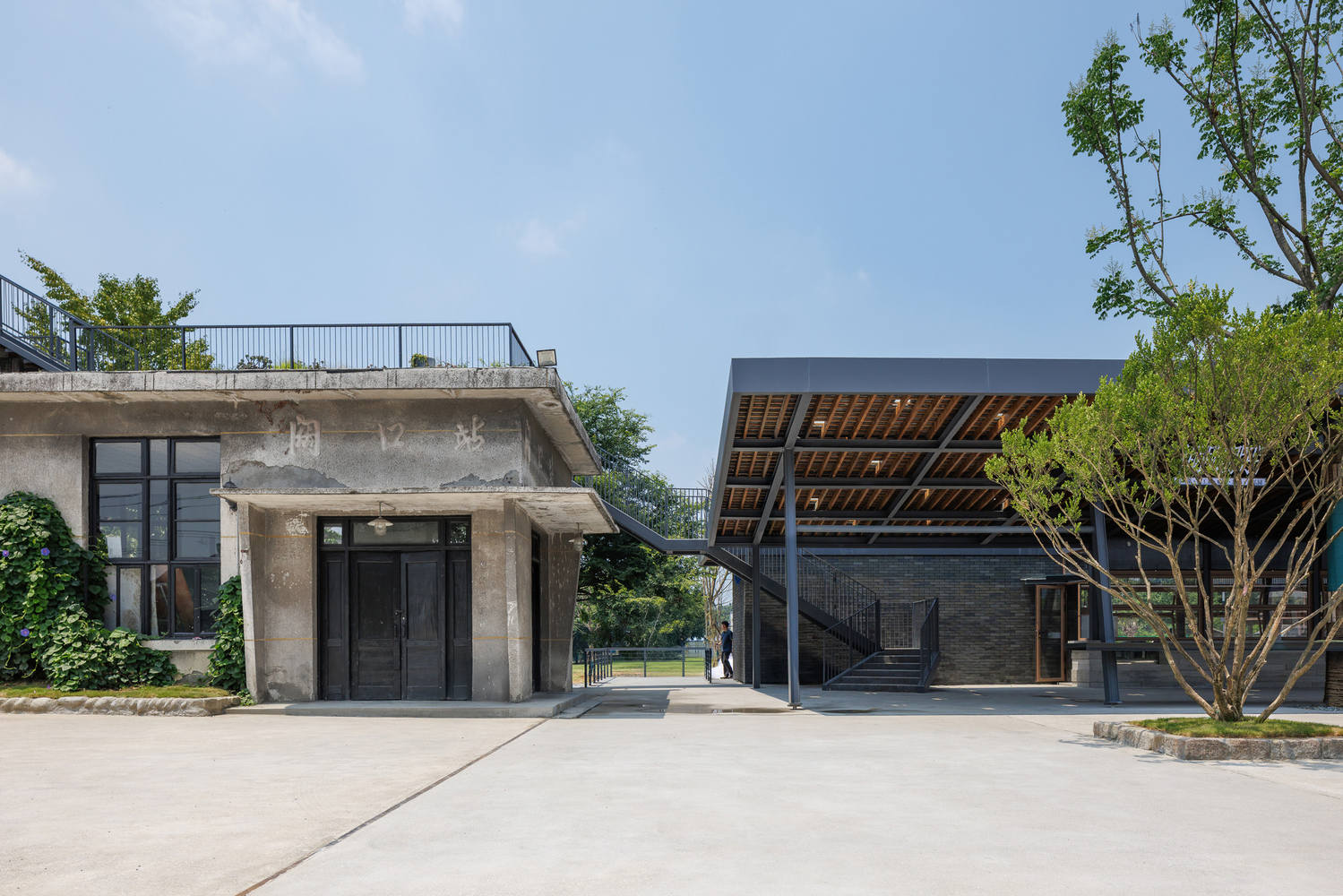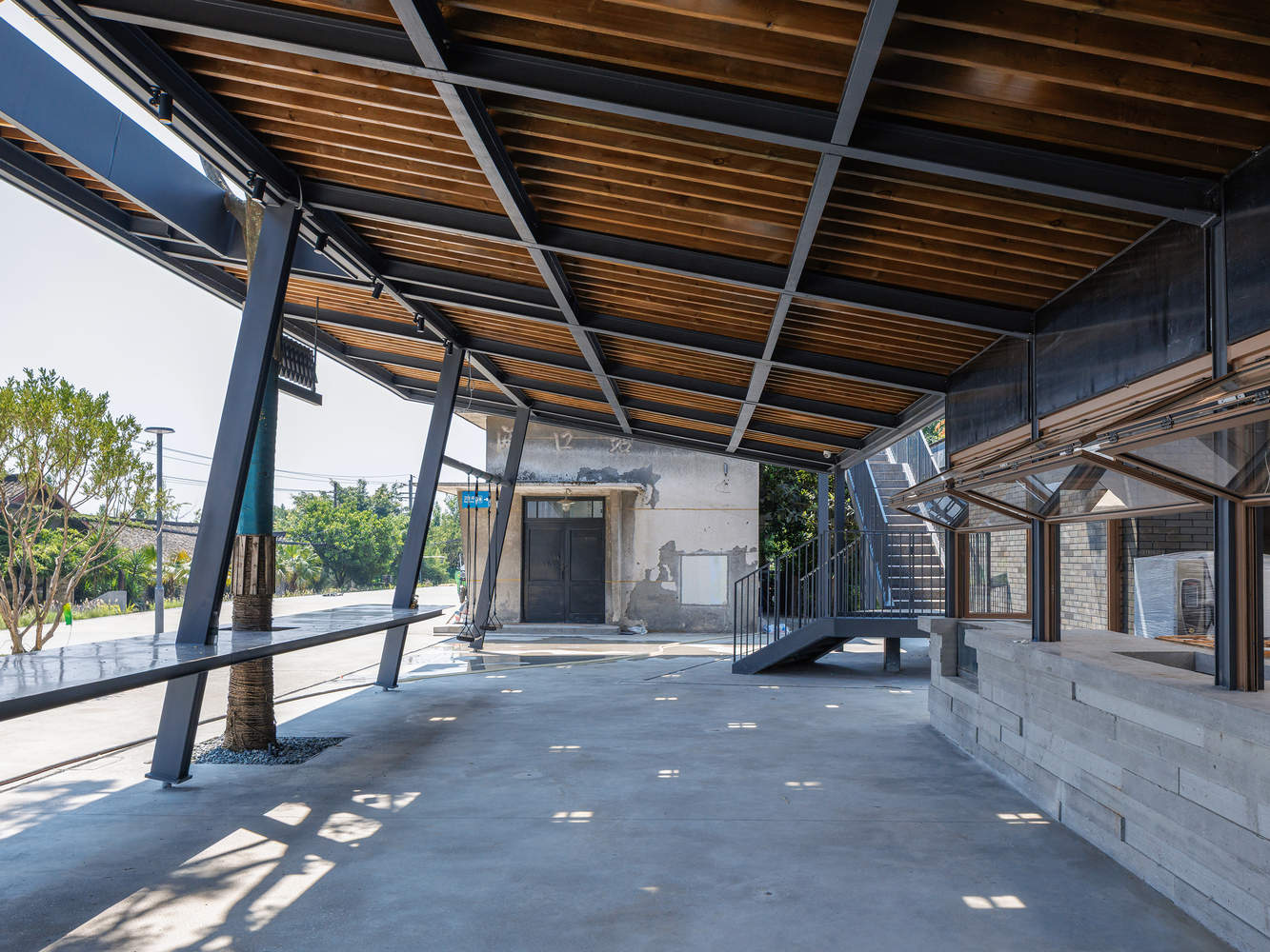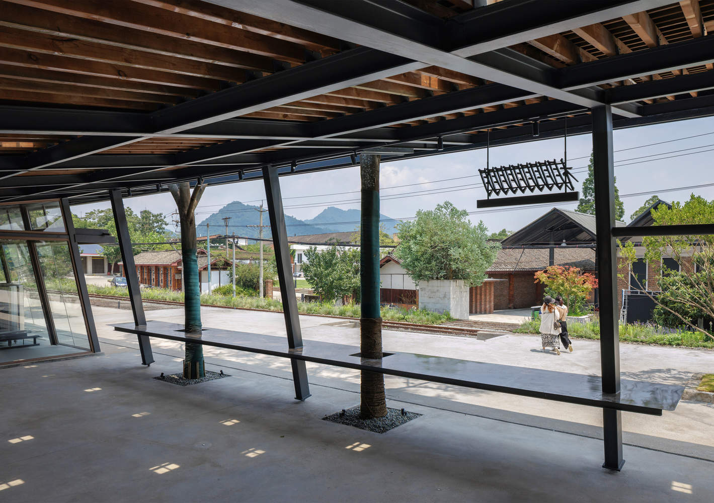 The design closely follows this regional characteristic of the Western Sichuan plain laborers’ custom of "building a shed" (搭棚棚儿) and the theme of "New Life for the Old Station." A quarter of the red line area was deliberately left open, extending a tilted semi-outdoor canopy, parallel to the original Guankou Old Station. This canopy serves as both a waiting area and the core of the restaurant. A lightweight steel staircase connects the canopy to the old station's roof platform without disturbing the original structure, transforming the historical space into an organic extension of the restaurant. To shape a light and transparent "shed," the main body of the building uses a steel structure. The steel columns under the shed incline along the ground, connecting at a 90-degree angle with the uplifted steel beams of the shed roof, "rooting" on the platform with a balance of strength and beauty.