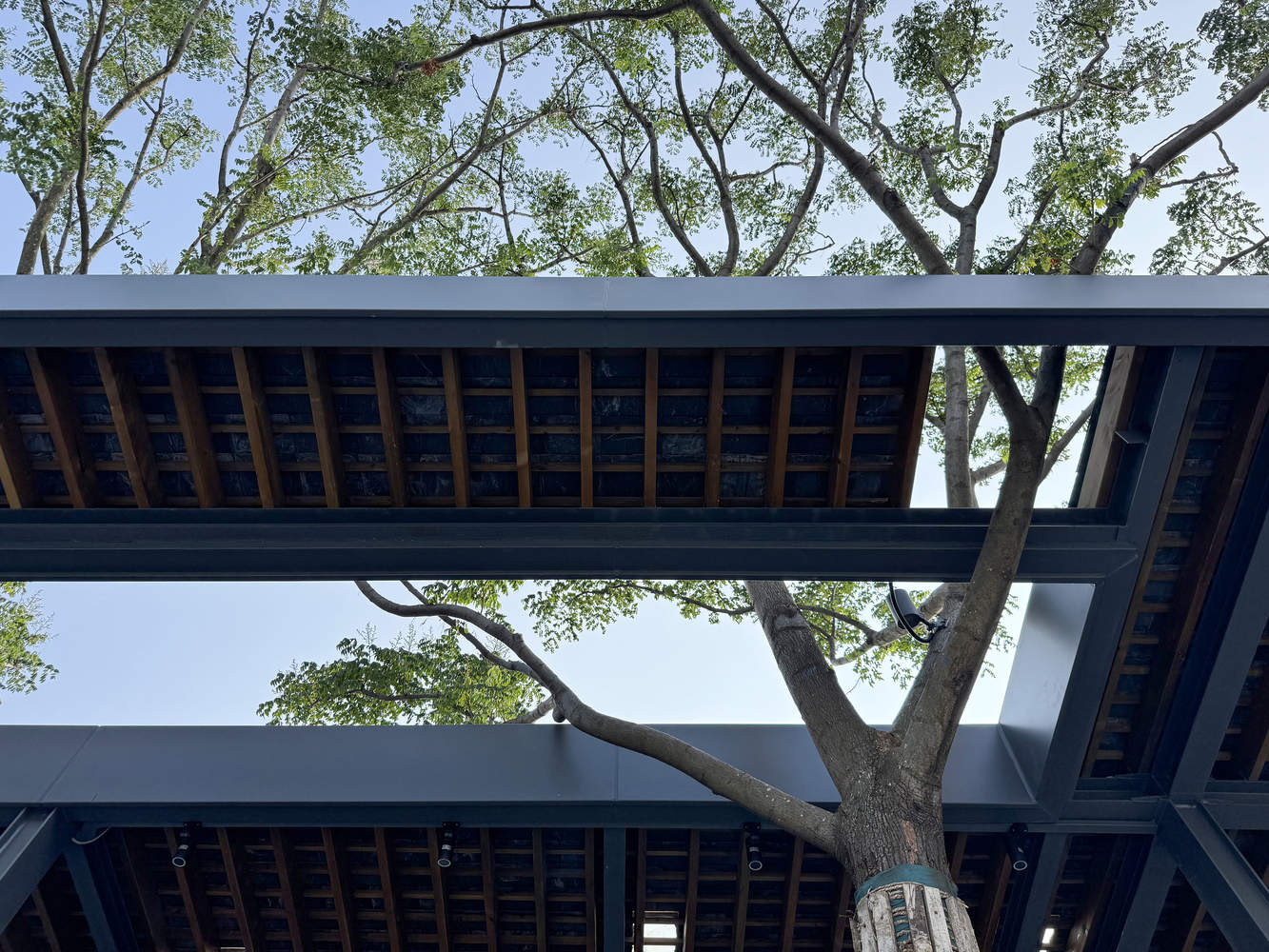 The purlin system supporting the tiles on the semi-outdoor shed is deliberately exposed, creating a unique visual experience overhead. Transparent tiles are interspersed randomly with slate tiles; during the day, sunlight filters through, creating dappled light spots; at night, tiny ground lights embedded in the floor project points of light, like scattered starlight, creating a romantic transition between day and night. There were originally two plane trees in front of the restaurant, and the shed was initially designed to have an opening for them. However, during excavation, it was discovered that the roots of both trees were hollowed out, and prolonged exposure during construction caused irreversible decline in their health. The two plane trees were relocated to a more suitable environment within the park, and two mature soapberry trees were replanted in their original positions. The branches of the new trees break through the shed roof, with the treetops offering a distant view of Longmen Mountain, becoming part of the architecture and continuing to grow.