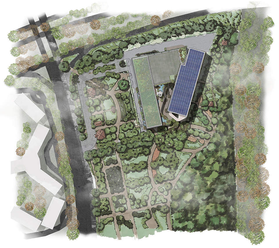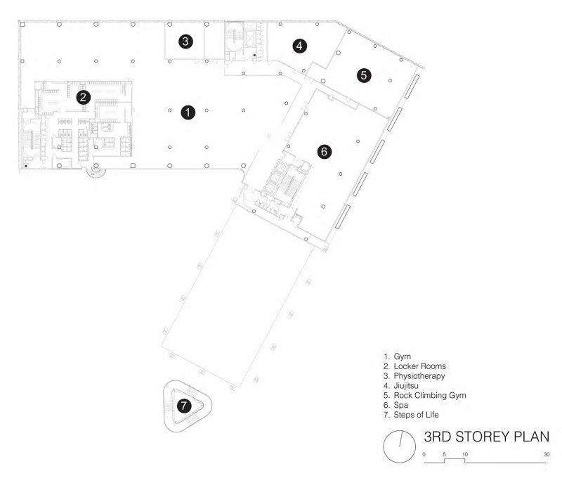 建筑围绕景观中庭分布,中央景观轴保证自然采光和通风,减少能耗。各功能区域划分明确,涵盖健身、理疗、攀岩、水疗等多种设施,满足军人及其家庭的健康和保健需求。DP 建筑师事务所展现出较高水准。建筑在体量、植被景观、雨水收集系统等方面设计巧妙,有效缓解降雨、减轻热岛效应。积极采用高能效 LED 灯光、热回收系统和光伏电池板等策略,降低能耗,获得相关认证。在材料使用上,选用环保混凝土和可回收钢材,减少内含碳排放量。整体而言,该作品在文化、功能和专业性上表现优异。