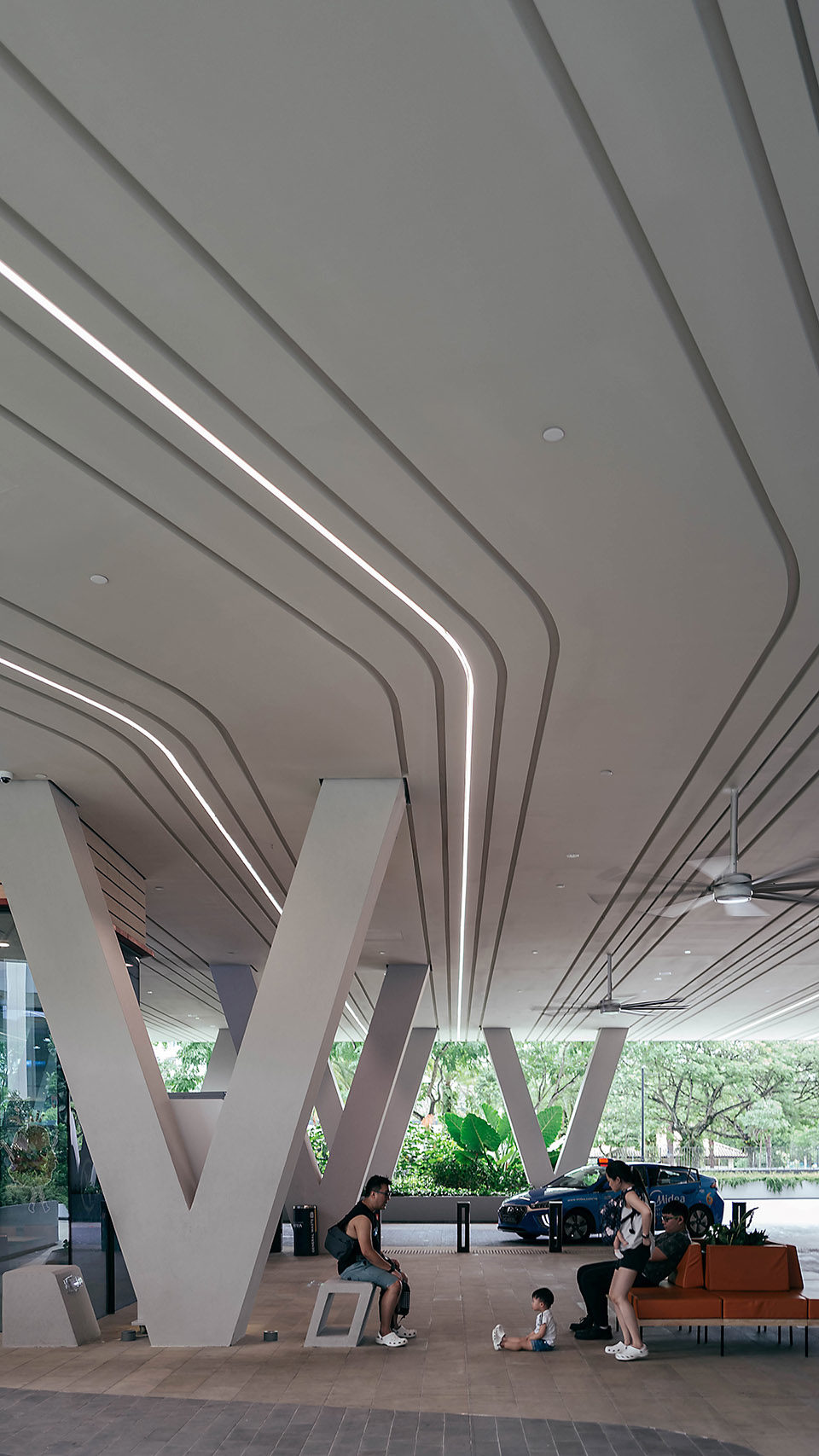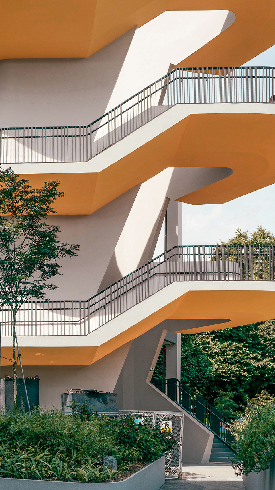 Secondly, planters strategically located along the building perimeter, derived through computational fluid dynamics, simultaneously mitigate wind-driven rain along the weather-exposed pathways and harness rainwater for irrigation to minimize water consumption. The incorporation of greenery also alleviates the urban heat island effect.