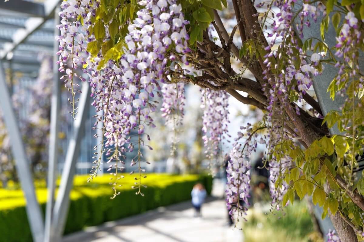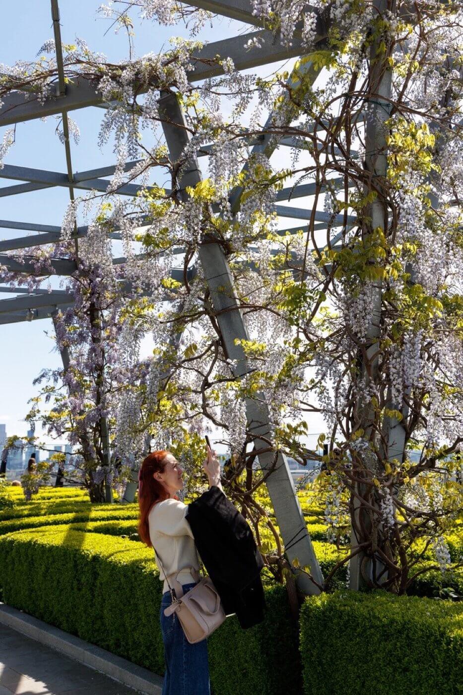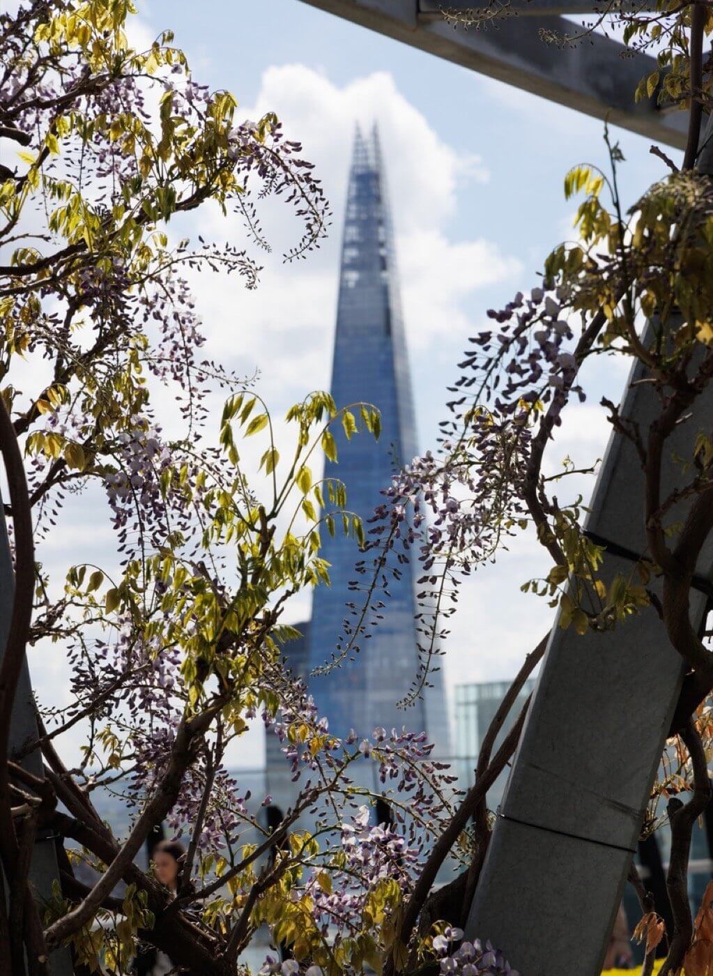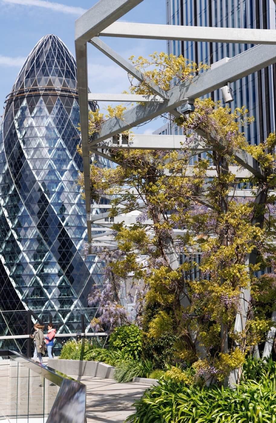 The design is required to deliver a beautiful public space whilst also integrating building services and energy efficiency requirements. Its centrepiece is a grove of 88 wisteria supported on a bespoke steel pergola, providing shade and scent to the roof terrace. Recent photographs show this year’s wisteria bloom being appreciated by visitors, as the living canopy overhead develops and matures. It provides a refreshingly tranquil escape from the dense City cluster and streets below. Educational and school groups, local workers and residents, tourists and passionate plant-lovers all take time to experience this sky-high oasis. Designed to BREEAM excellent, the scheme combines herbaceous planting with evergreen clipped structural planting, thriving climbers, vines and espalier fruit. Arrival is by elevator into the wisteria-draped invigorating space. Plentiful seating encourages visitors to sit amongst the planting and take in both the serenity of The Garden and the dynamism of the city all around.