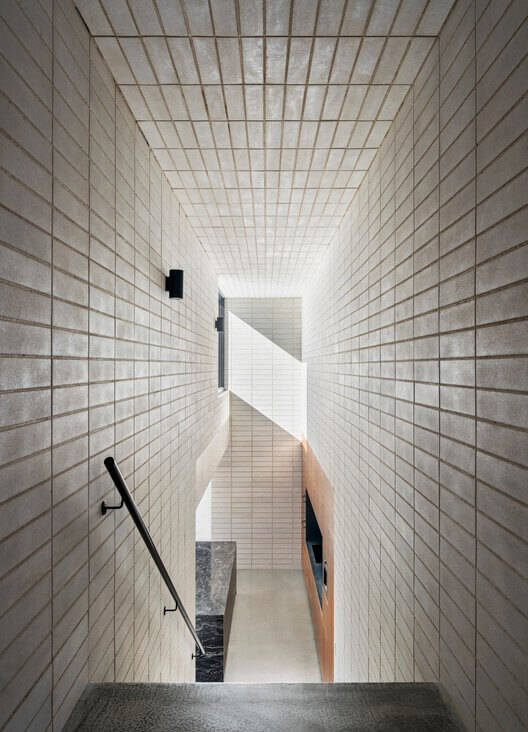 选择GB砌体砌块是因为其尺寸一致性,使萨克斯比砌砖能够自信地铺设毫米精度的长水平和垂直图案。瓷器的光滑表面因其哑光均匀的外观而被选中,使表面同时显得酥脆柔软。这项工作证明了一位砖瓦匠希望突破他们的技能和材料的极限。