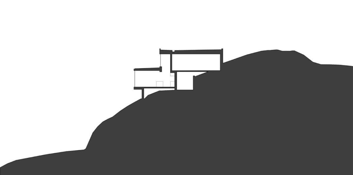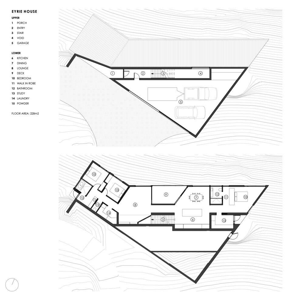 Eyrie House 由马特・威廉姆斯建筑师事务所设计,位于朗姆尼山山顶陡峭斜坡上,可俯瞰壮丽景色。设计上,为与场地崎岖景观形成对比和强调,由水平基准面和折叠形式组成。因场地陡峭且通道有限,住宅平面图倒置,车库在上,住宅在下,这带来了居住者从上层入口进入房屋的设计问题。