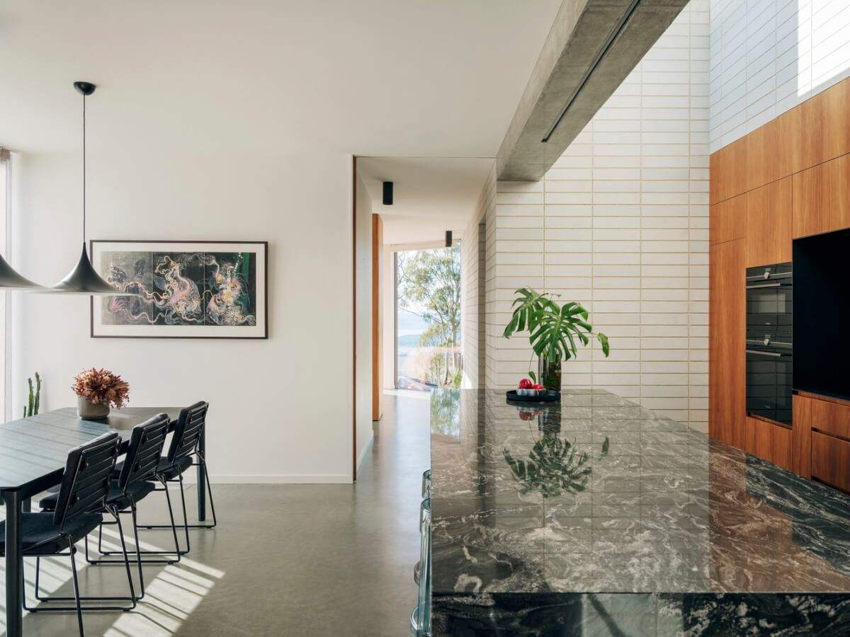 The blocks were carefully mitered to create the pleated faces and very acute angles of the entry porch; fixed to the ceiling of the void to complete the monolithic volume; and meticulously stacked within the residence. While the blockwork walls and ceiling are striking upon entry, once inside the residence they provide a calm, solid backdrop to the home, allowing the spectacular outlook to take center stage.