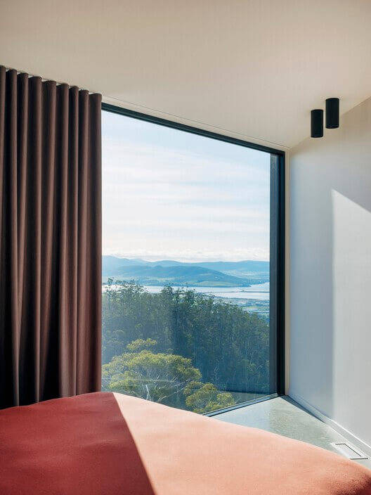 鹰巢屋是位于朗姆尼山山顶一处非常陡峭的斜坡上的新住宅,可俯瞰皮特沃特和塔斯马尼亚东南部的壮丽景色。该设计旨在与场地的崎岖景观形成对比并加以强调,由一系列水平基准面和简洁的折叠形式组成。
