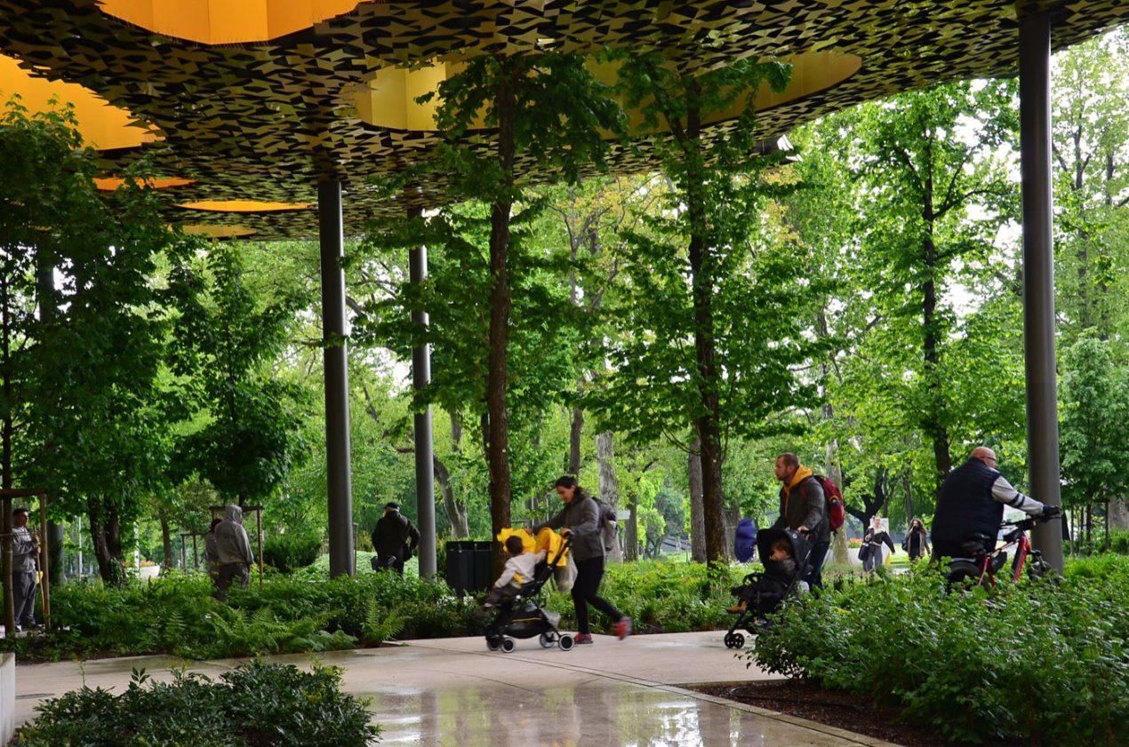 The building’s non-directional shape and transparent design welcome visitors from all angles, symbolizing openness akin to music’s universality. The integration of natural and built elements extends throughout the structure, with features inspired by the flow of sound waves and the surrounding environment. The roof’s delicate design, resembling a canopy, allows natural light to filter through, while its shape accommodates existing trees. Inside, spacious interiors echo the ambiance of a woodland walk, characterized by light architectural structures. Expansive glass panels offering uninterrupted views of the park.