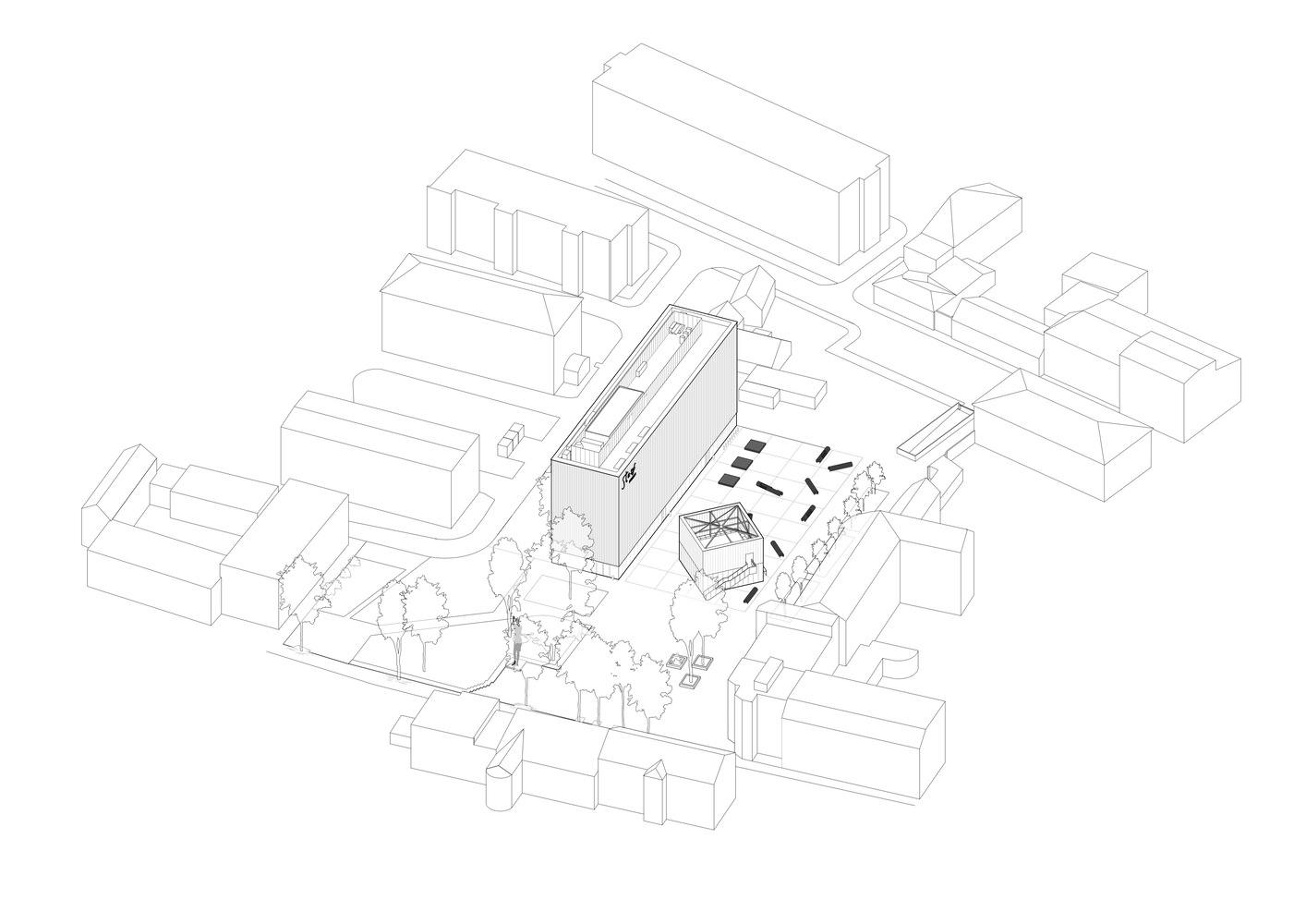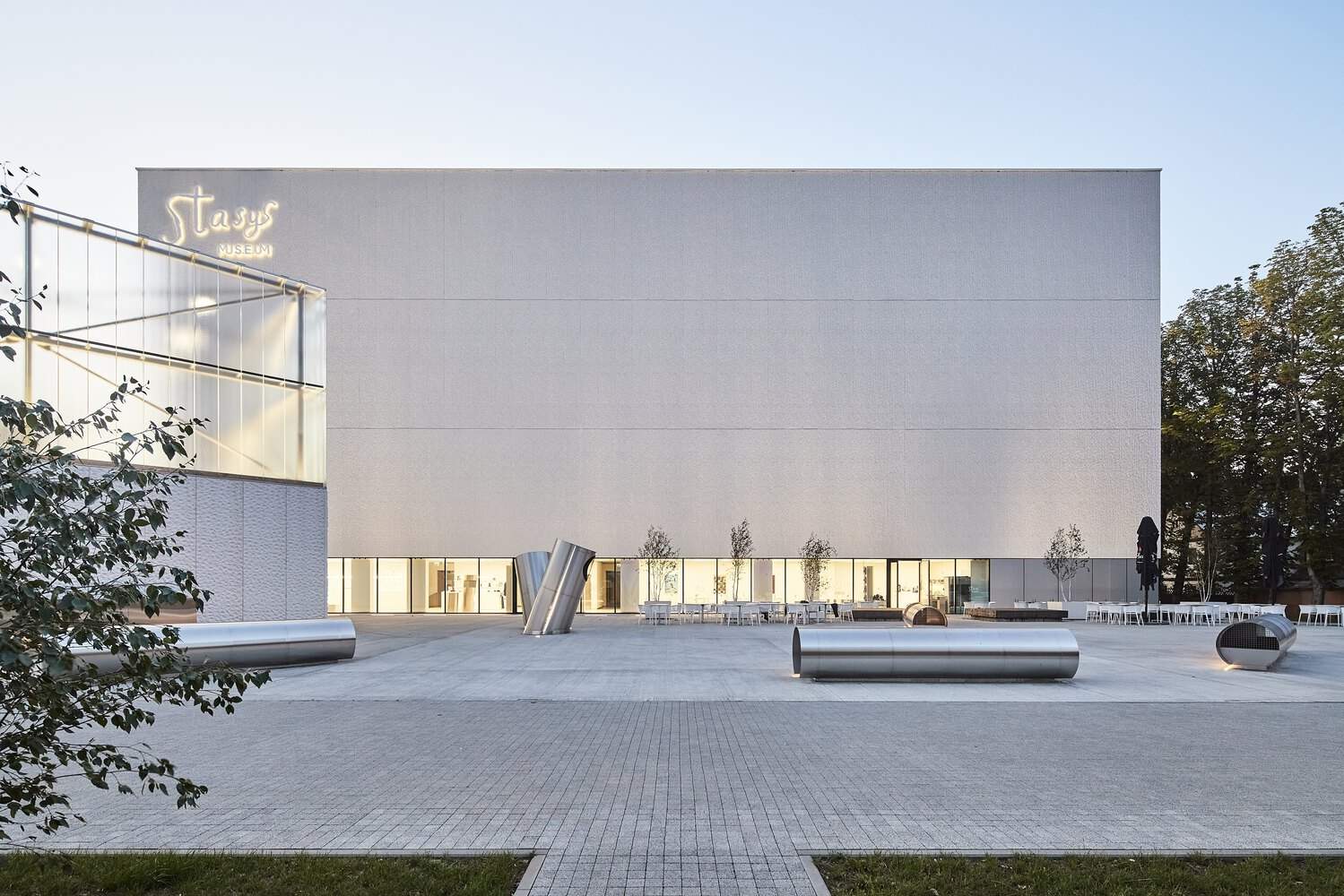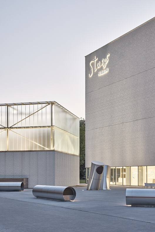 建筑师提供的文字描述Text description provided by the architects. Stasys Museum is located in Panevėžys, Lithuania, in the northern part of the city center. The main goal of the project was to enhance city development by creating a high-quality public environment that enriches the city center. It focuses on serving the public interest by improving the quality of life and promoting cultural awareness and artistic expression within a democratic, communal space. Additionally, the museum seeks to establish itself as a leader in public services through superior content and functionality.