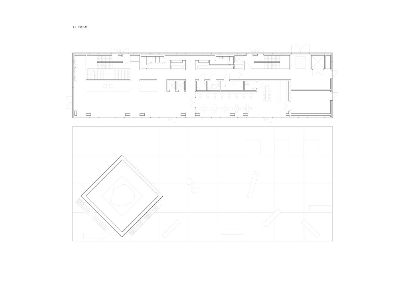 设计的新公共空间充当了Krantas和Respublika街道之间的桥梁,同时在西部景点中心和Oxbow湖之间建立了高质量的联系。该项目的公共空间由两个区域组成——北部的活跃休闲区和南部的创意城市区。户外空间包括一个展览馆、咖啡馆和一个举办各种活动的区域:户外电影院、音乐会、表演和街头艺术。该建筑的功能包括两层楼的博物馆和展览馆,其中一层用于教育和行政,第二阶段的小厅目前用作入口空间,将成为一个专门用于媒体相关展览的空间。与建筑的形状和美学相呼应,立面的材质简洁明了。选择了两种纹理混凝土[点状和线性图案]和玻璃幕墙系统。