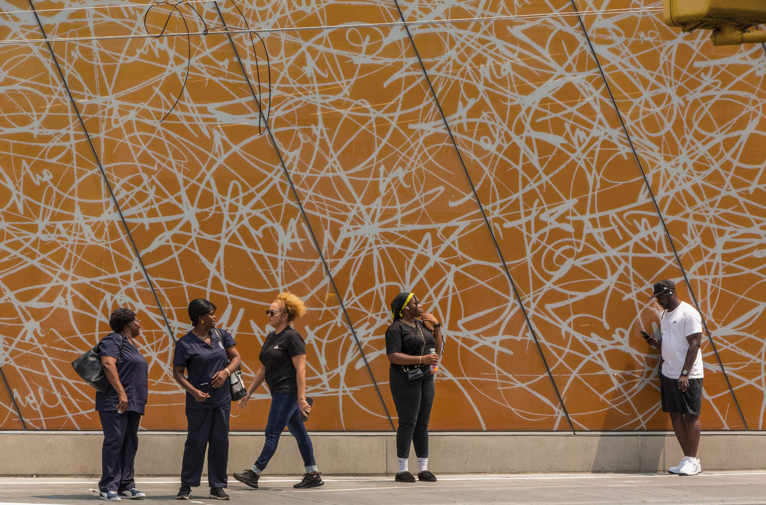 Writers commit thoughts and ideas into action, translating knowledge to bring people together. From its open massing to its facade, the Library was a collaboration with Parlá to translate Far Rockaway's rich cityscape and collective energy. Both Parlá's work and the name of the library are born from New York City's writing culture, an artistic movement young artists created art on the walls and subway trains of the city during the sixties and early seventies when many people felt current forms of writing were not so beautiful. Located at the prominent intersection of Mott and Central Avenues, the library's façade features custom panels designed by Parlá that visually reflect the city's vibrant cultural history. In turn, it draws on the many languages that are spoken in Far Rockaway and movement along the street. Clad in fritted, colored glass, with a color gradient reflective of the sunrise off Long Island's coast, the design balances transparency and translucency as it interprets the experience of the city. As a key investment in Far Rockaway, the library was designed as a welcoming center for the neighborhood and its residents. The entry is announced with a tall transparent glass opening at the corner. The interior is organized around an inverted pyramidal atrium, which allows the penetration of natural light to the ground floor as well as a view of the sky from within the building. Combined, they provide the entry and circulation sequence through the building and orient the visitor within.