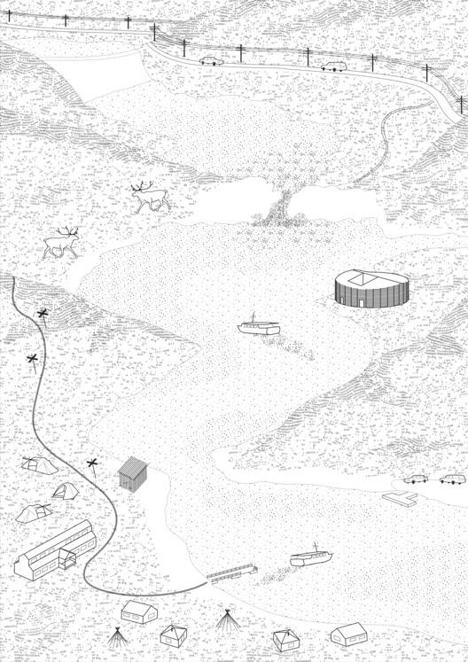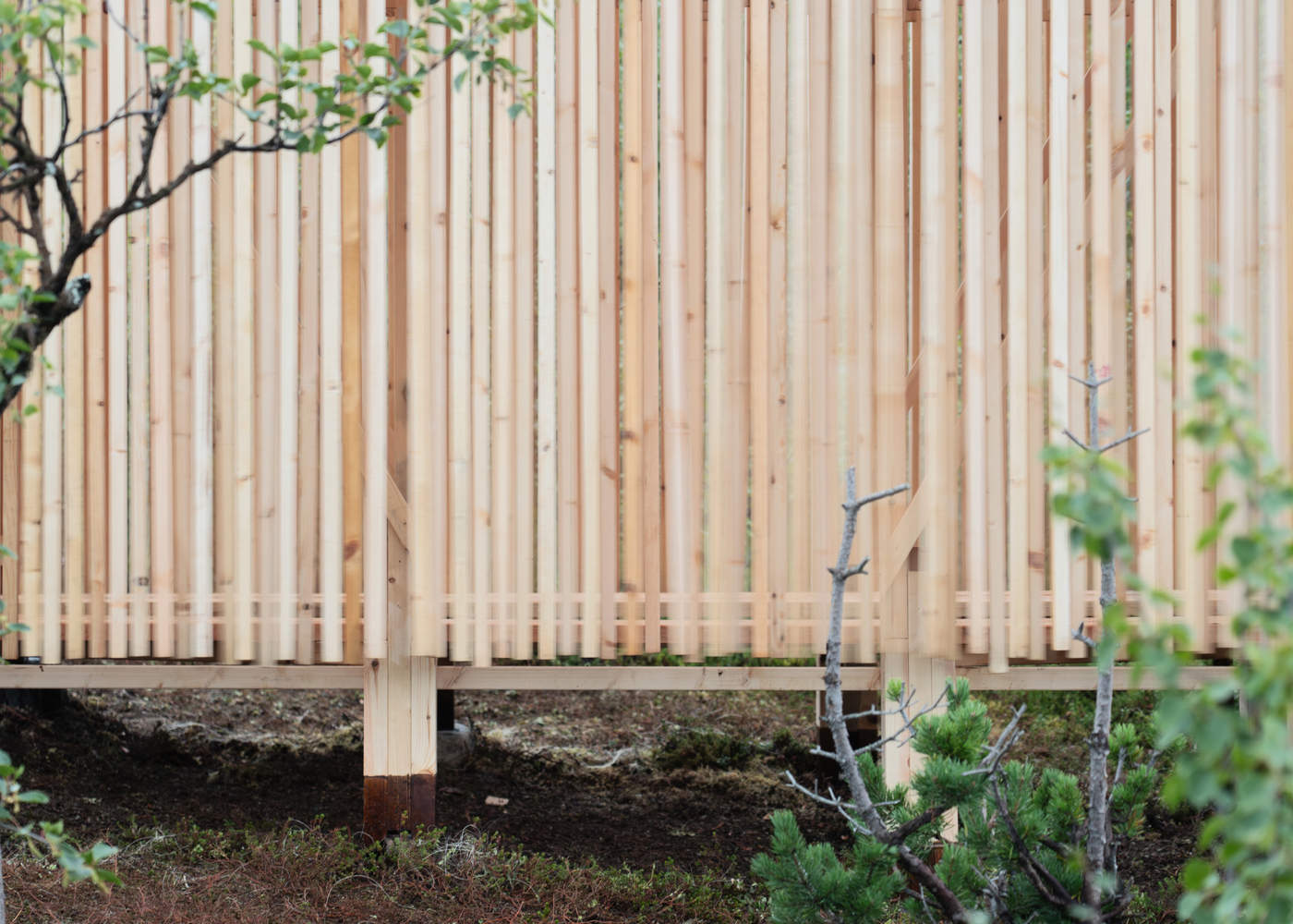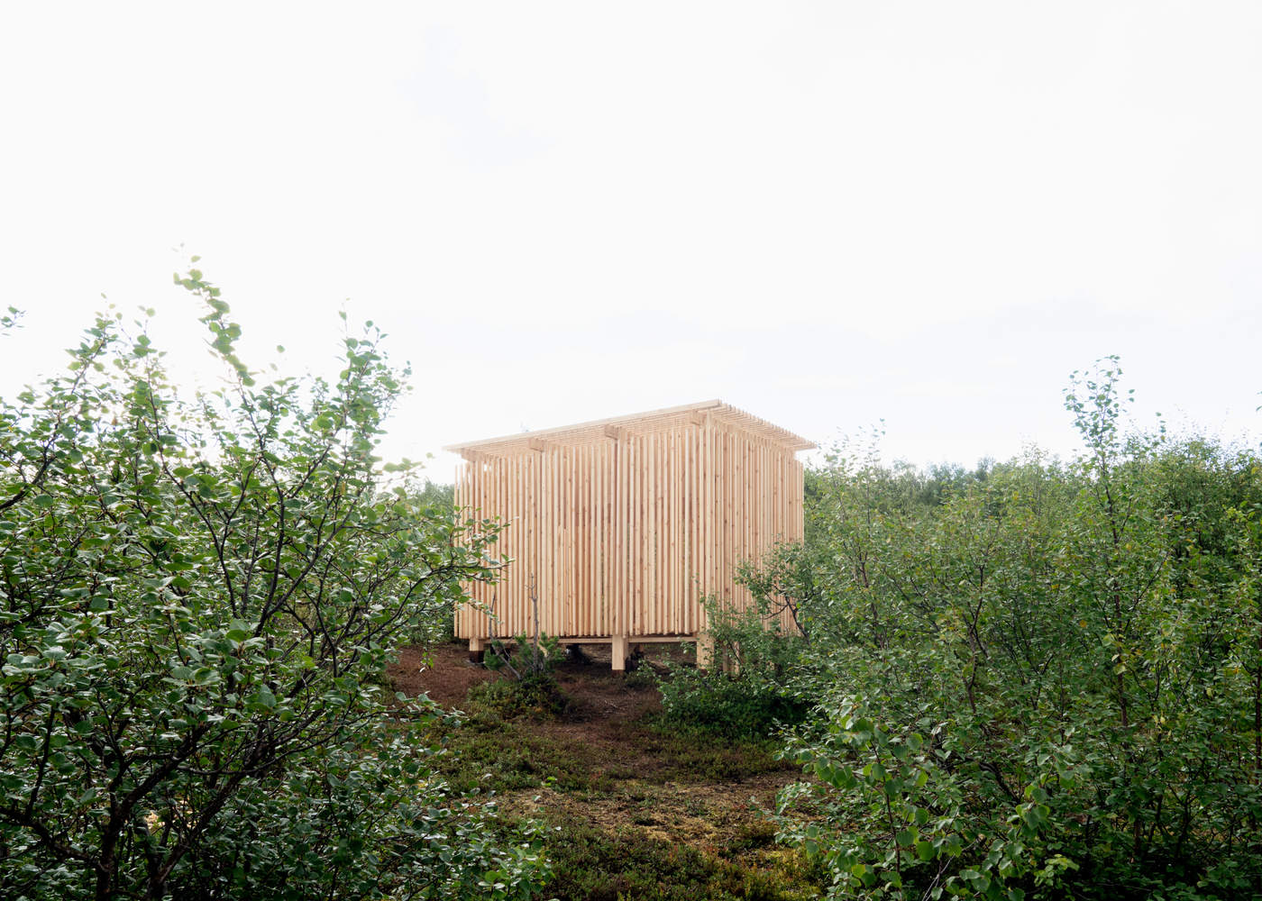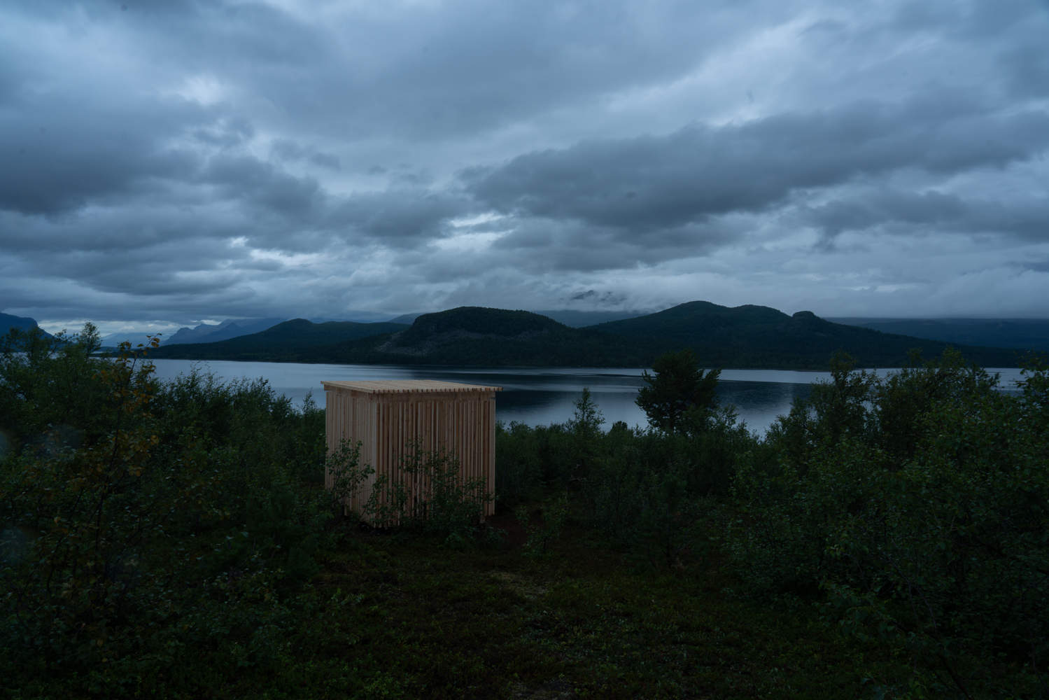 An important aspect of the building process was how we could learn from the Sami and nomadic tradition of relating to the landscape, that "we do not inherit the earth from our ancestors; we borrow it from our children". Meaning that we had to build in a way that left an as small footprint as possible. The pavilion stood in the mountains of Saltoluokta until right before the snow arrived in September, when it was dismantled, leaving nothing but a few rearranged stones on the ground. The installation was later exhibited at Luleåbiennalen which allowed the team to reiterate the structure for an urban context and the other end of the Lule River, where the water is looked upon differently; as a mere source of energy and key in Sweden's ongoing transition to carbon-free production.
