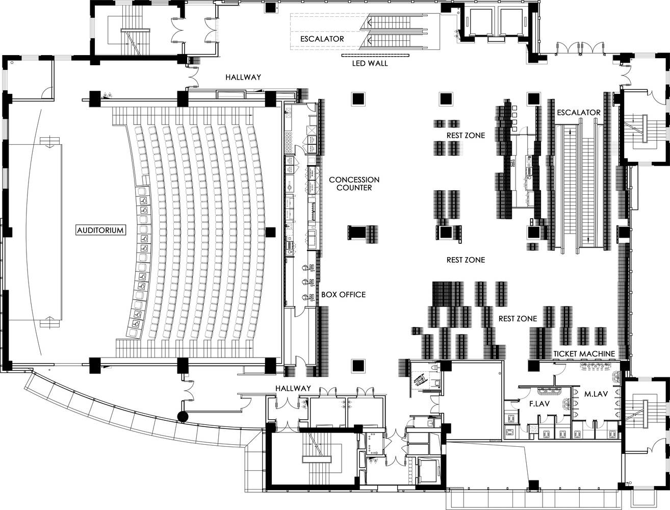 在这家电影院里,有阳光照射进来。没有多少电影院有窗户可以让阳光照进来。我们精确地放置了看起来像波浪的砖块,这些波浪以这样的方式分层,你可以从任何角度看到它们。所有巧妙地放置在角落里的灯,以及只有抬头才能注意到的通风口。如果你从某个角度看,砖块的放置方式是,没有一块砖的长度是一样的。继续往前走,你可以看到桌子和椅子排列成波浪状,弯曲的末端像铃铛一样张开。砖块爬上墙,涂上了黄水晶的色调。如果你仔细观察这些砖块,它们表面很粗糙,但气氛比你想象的要柔和。大厅的精髓可以在最黑暗的黑暗中或光天化日之下捕捉到。砖块被仔细地重新排列,就像午夜图书馆的书一样。我四处走动,注意到地板上的小波浪,它们的两边都漆成了灰色,我一英里外都能看到。反射到它们上的灯光可以防止它们绊倒,所有这些不仅仅是为了美观,也是为了防止对客人和游客造成伤害。如果你环顾四周,你可以看到变成台面和隔间的波浪,所有的曲线都向不同的方向俯冲。