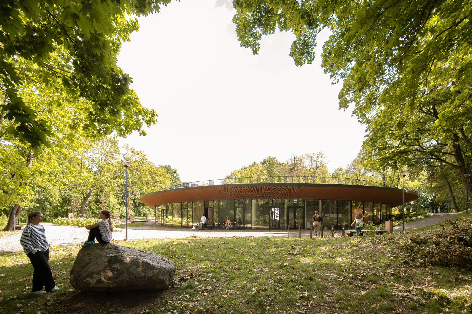 这座新建筑位于风景如画的老城市公园内,有几条河流、溪流和池塘,它不会掩盖历史悠久的农舍或公园。相反,它与周围环境融为一体,让公园的绿地通过大窗户流入建筑的内部空间。