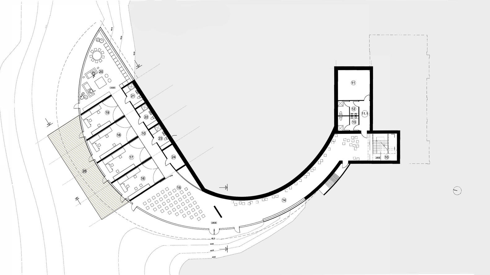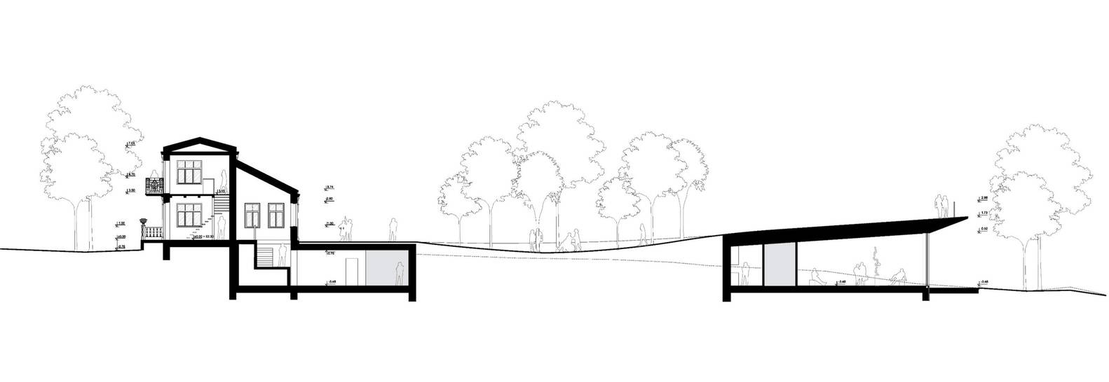 Located in the old and picturesque city park, which features several rivers, streams, and ponds, the new building does not overshadow the historic farmhouse or the park. Instead, it integrates smoothly into its surroundings, allowing the greenery of the park to flow into the building's interior spaces through its large windows.
