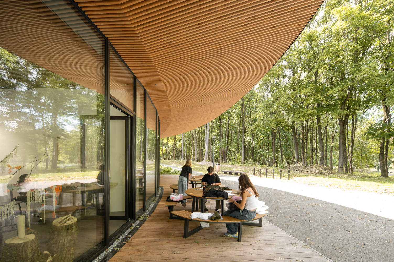 The second phase introduced a new extension with a contrasting identity. The design features a winding corridor that leads to new workshops and gallery spaces built beneath the orchard. The extension takes full advantage of the terrain differences between the homestead and the nearby stream. The facility includes studios for art, design, applied theater, audio-video, and alternative photography, as well as an exhibition space. Artworks on permanent display can be viewed both inside and outside the building. The curved glass structure seamlessly blends with the trees and landscape of the surrounding city park. The interior is characterized by solid, natural materials, including concrete floors and walls, wood-paneled ceilings, and monochrome-colored furniture.