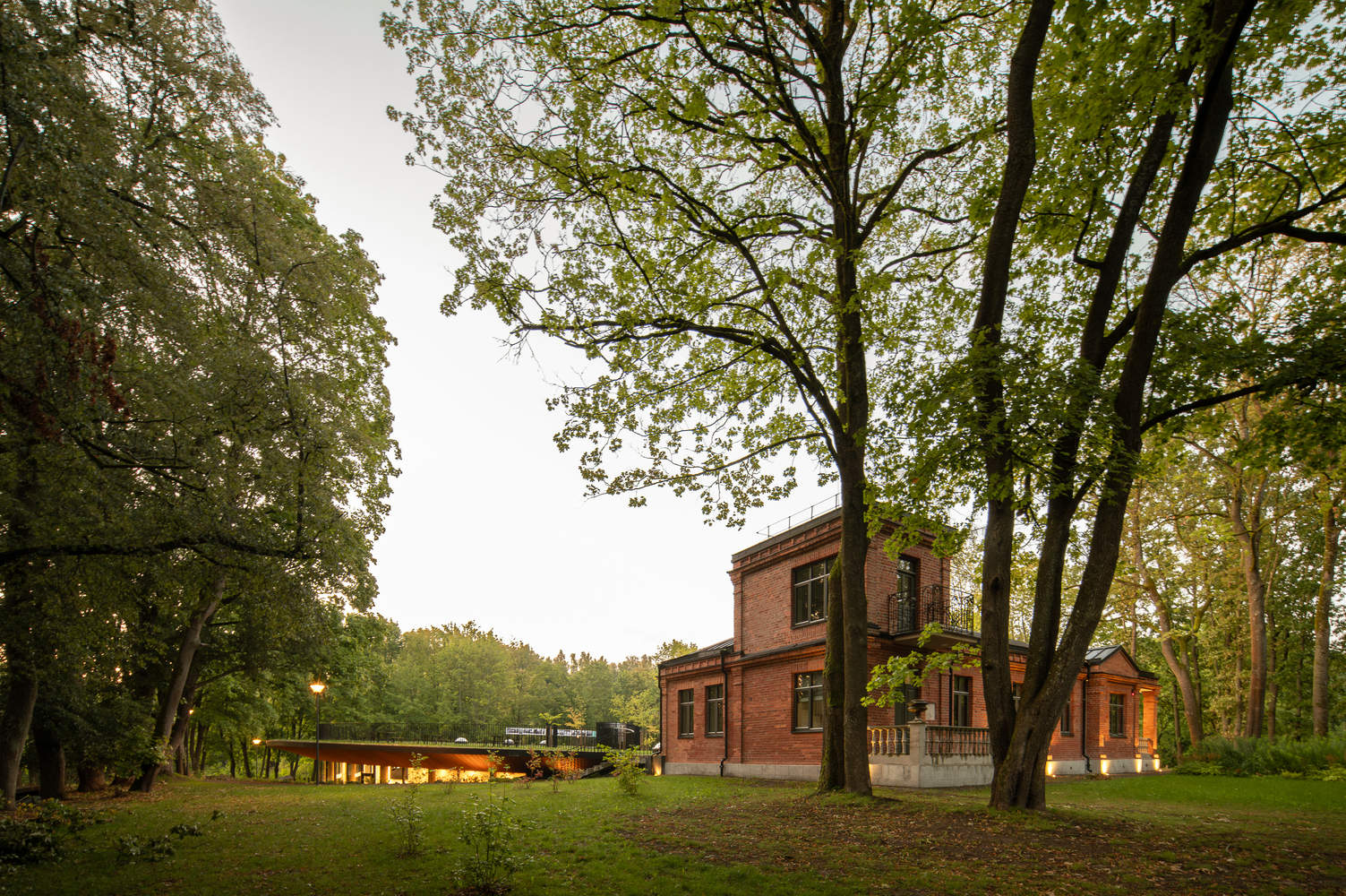 Text description provided by the architects. A historic manor in Panevėžys, Lithuania, has been revitalized as an art residency and creativity center following a meticulous reconstruction. The protected red-brick homestead was carefully renovated, with historical details restored, and a new, modern, spacious extension was built to harmonize with the natural terrain of the surrounding park.
