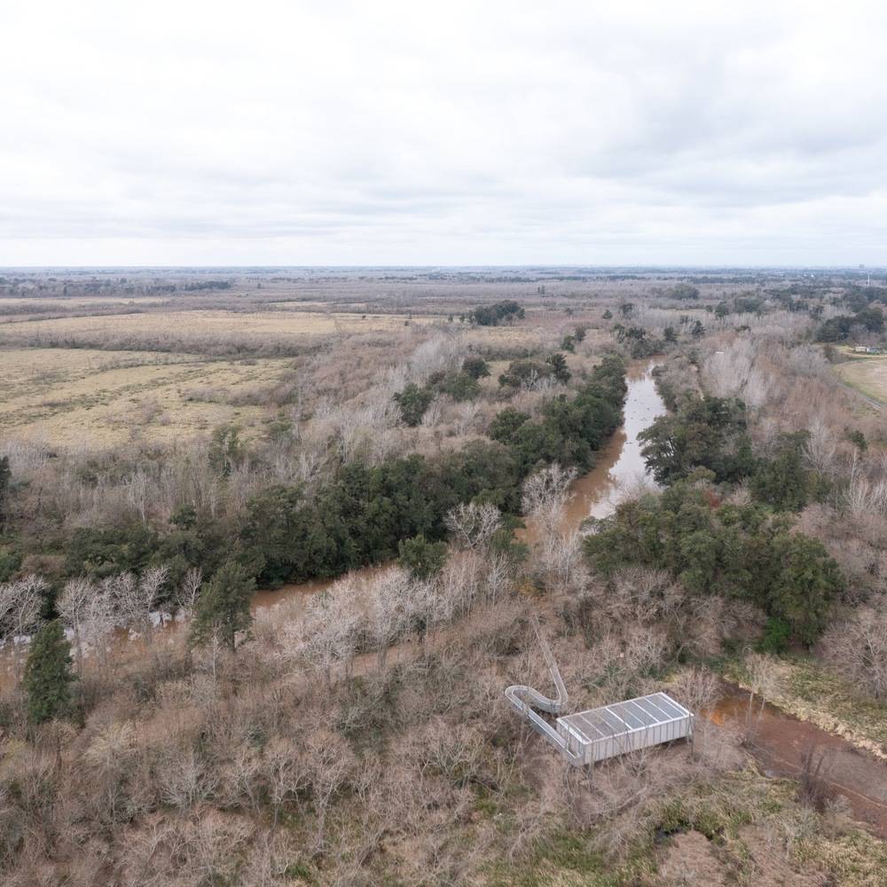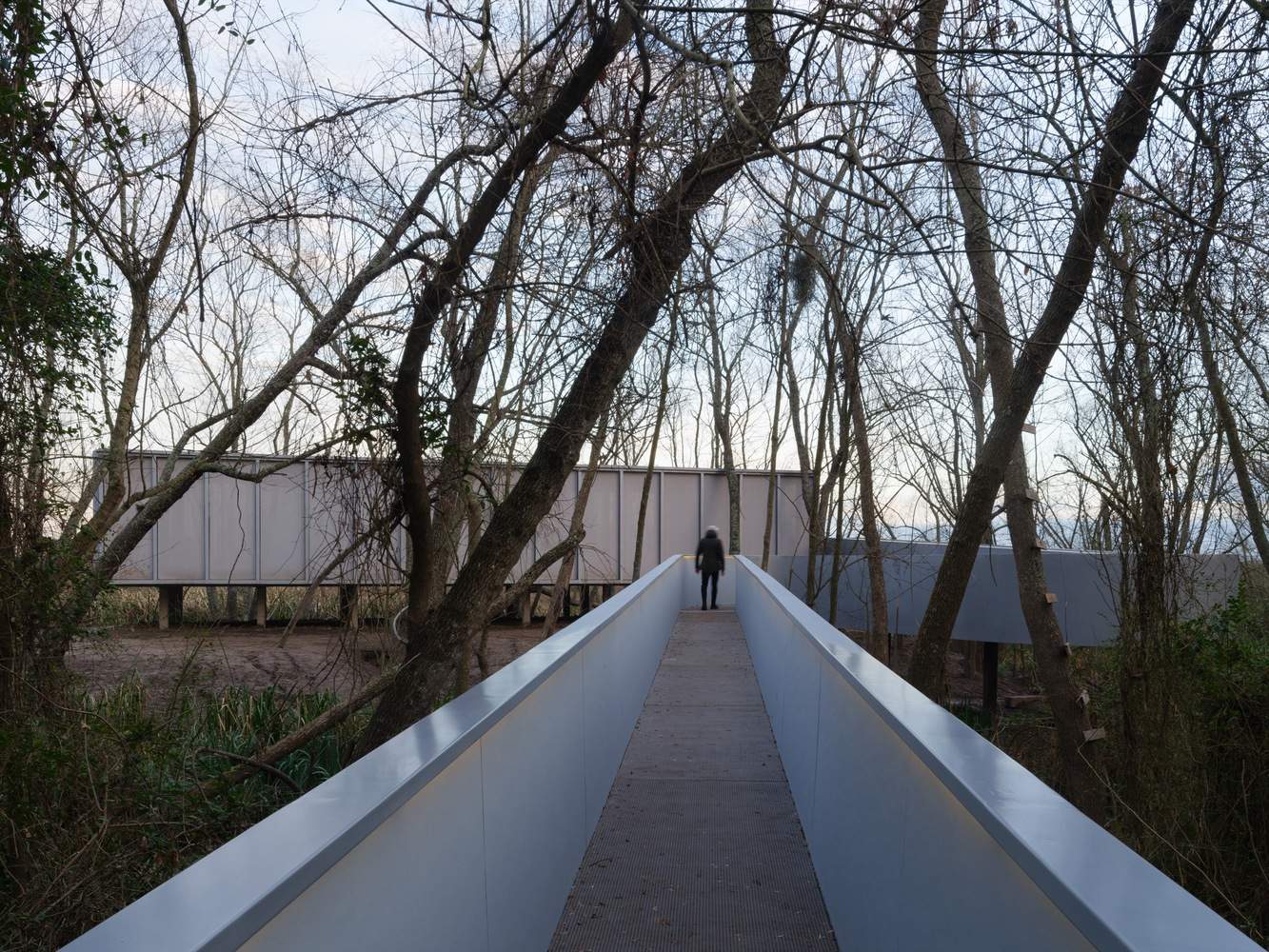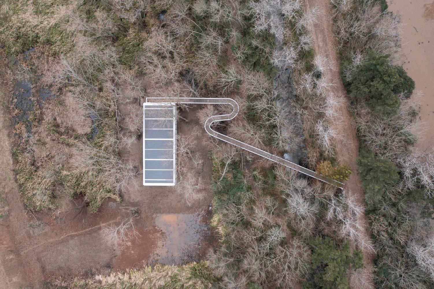 Horizontal Folly. The pavilion is conceived as a neutral element, elevated on columns in a swampy area and surrounded by trees, in a deep widening halfway through the reserve. This structure offers a dynamic and flexible use space within a conservation ecosystem, serving as an interpretation center designed to merge the educational and cultural experience with its natural surroundings.