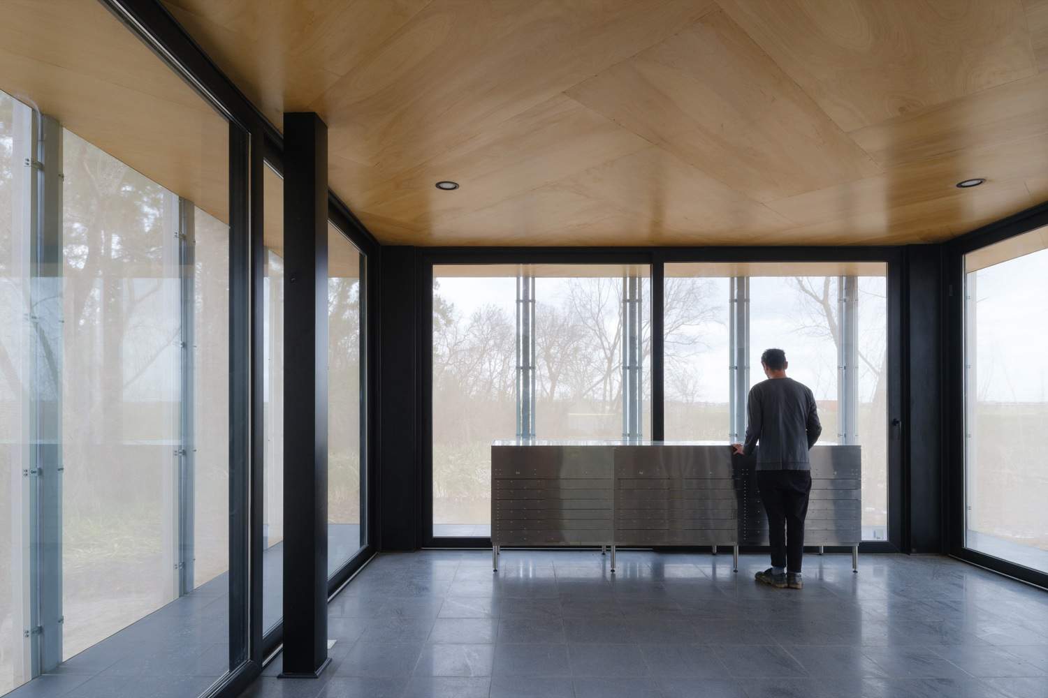 The design articulates a large single space with its context through a perimeter thickness, formed by glass and mesh enclosures that act as environmental mediators. A compact module houses essential services, condensing visitor reception and operational spaces at the building's entrance. The intervention is completed with a walkway that connects the main path to the building, winding through the trees. This journey is conceived as another event in the overall experience, integrating into the landscape and multiplying visual connection points.