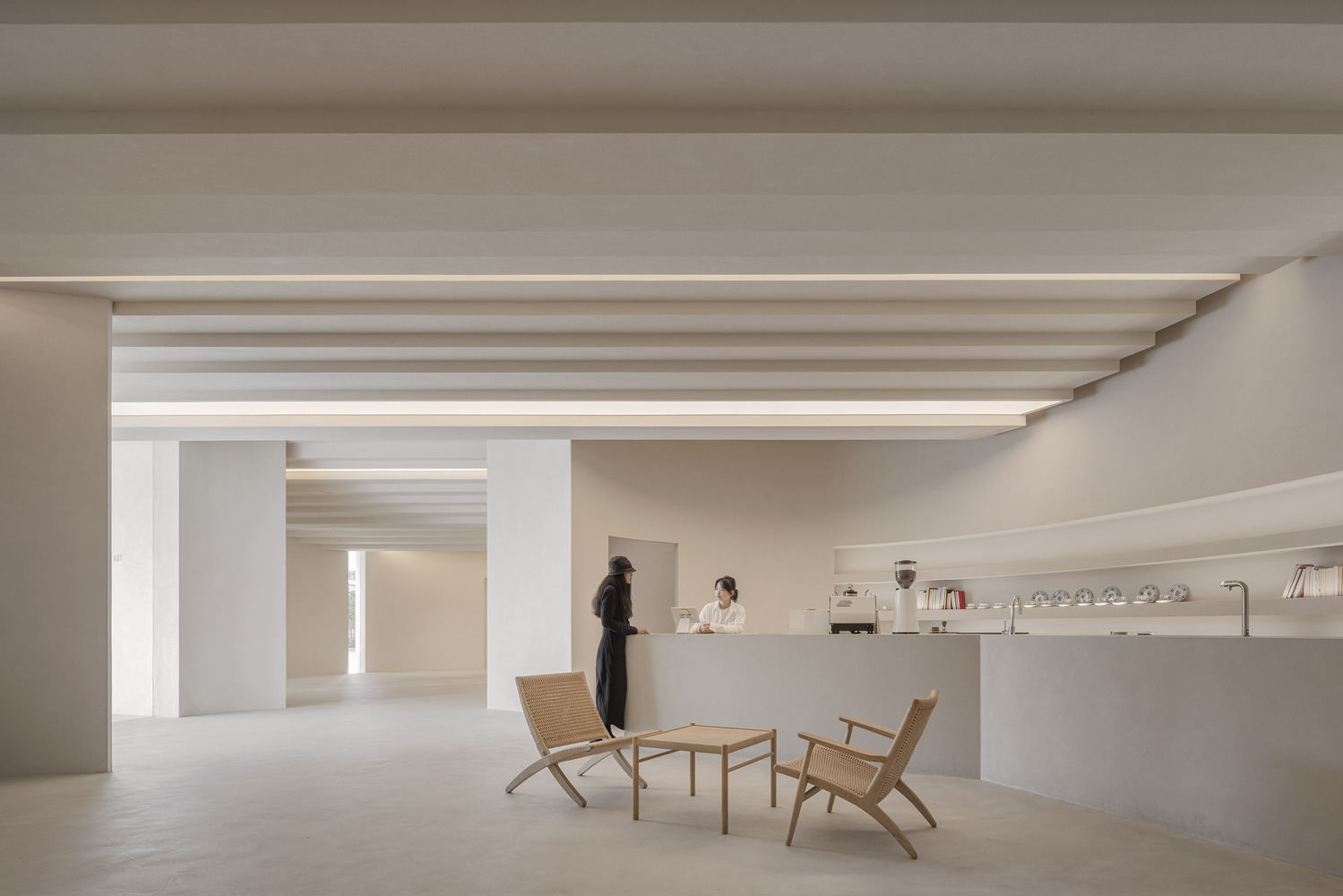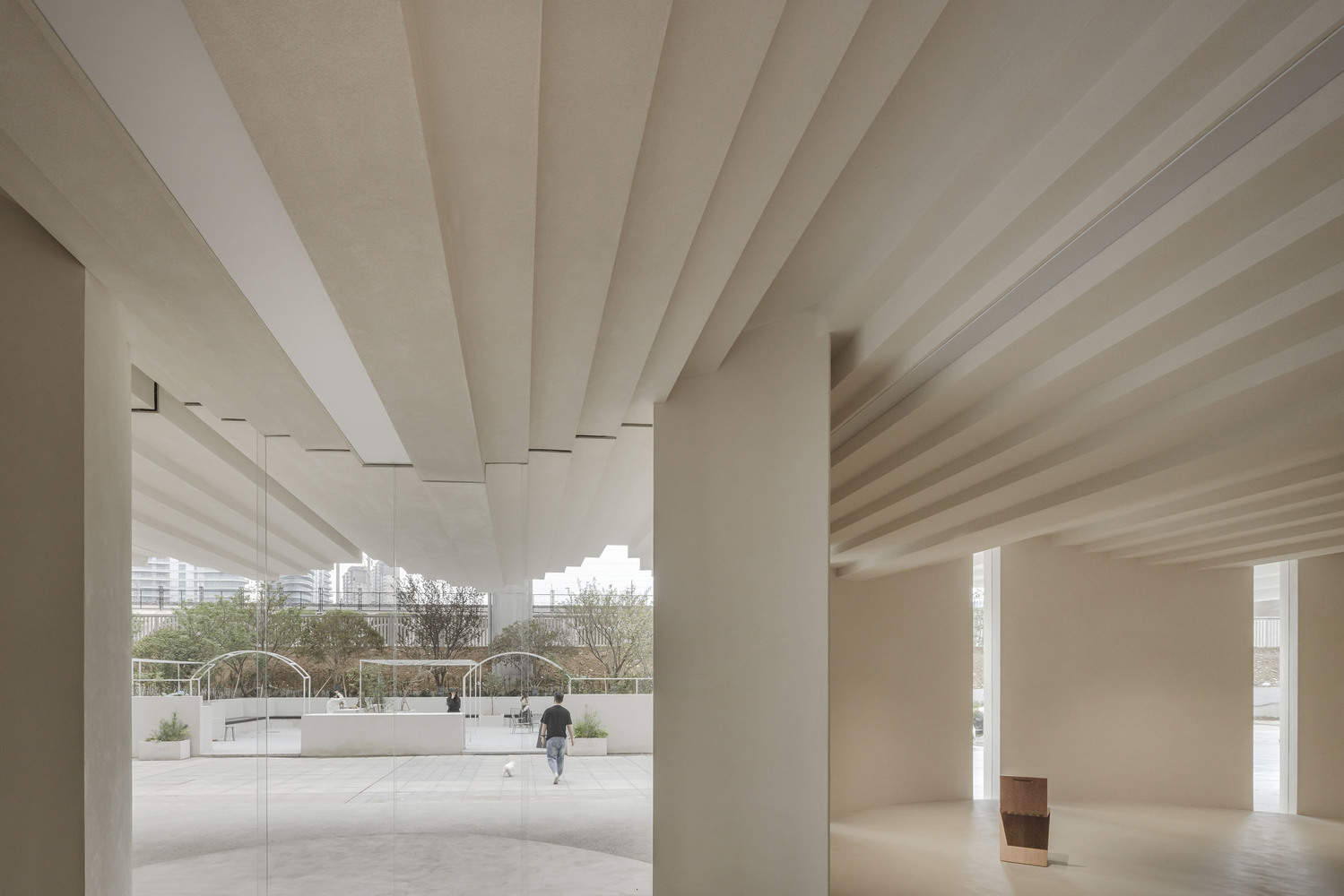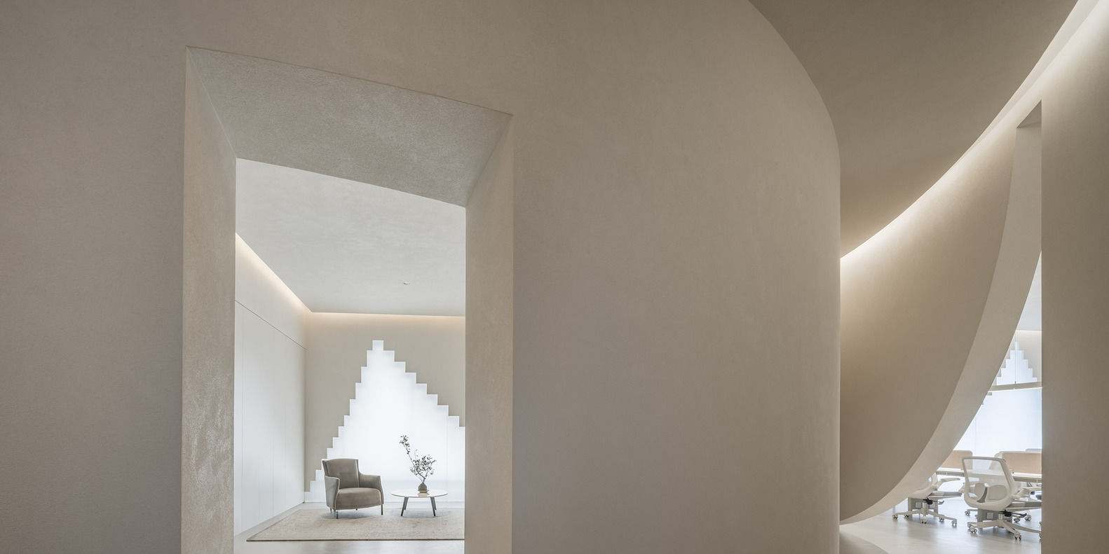 在一楼,一个广阔的灰色空间邀请对话、关怀和联系,反映了当地社区对共享体验的渴望。这个空间激发了人们的想象力,将居民引向艺术和美,将平凡与非凡融为一体。上图,博物馆锯齿状的屋顶与下方的展览空间相呼应,由弯曲的墙壁支撑,形成了一条蜿蜒的小径,让人联想到中国花园,在那里,自然光和阴影一起跳舞,营造出永恒的氛围。上层是开放式艺术办公室的中心,延续了底层展览空间的叙事。弯曲和起伏的墙壁打破了传统工作空间的僵化界限,促进了创造力和协作。通过这种方式,博物馆超越了其作为艺术容器的角色,成为了思想的孵化器。