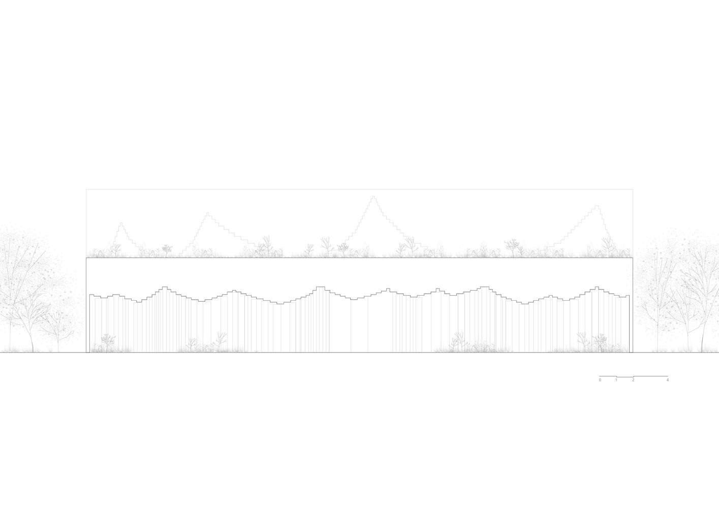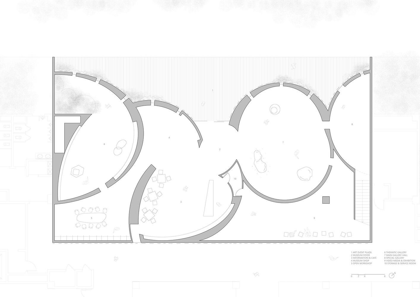 On the ground floor, an expansive grey space invites dialogue, care, and connection, reflecting the local community's yearning for shared experiences. This space stirs the imagination, drawing residents towards art and beauty, infusing the ordinary with a sense of the extraordinary. Above, the museum's jagged roof echoes the exhibition spaces below, supported by curved walls that create a winding path reminiscent of Chinese gardens, where natural light and shadow dance together, creating a timeless atmosphere. The upper level, a hub of open art offices, continues the narrative of the ground floor's exhibition space. Curving and undulating walls dissolve the rigid boundaries of traditional workspaces, fostering creativity and collaboration. In this way, the museum transcends its role as a container for art, becoming an incubator for ideas.
