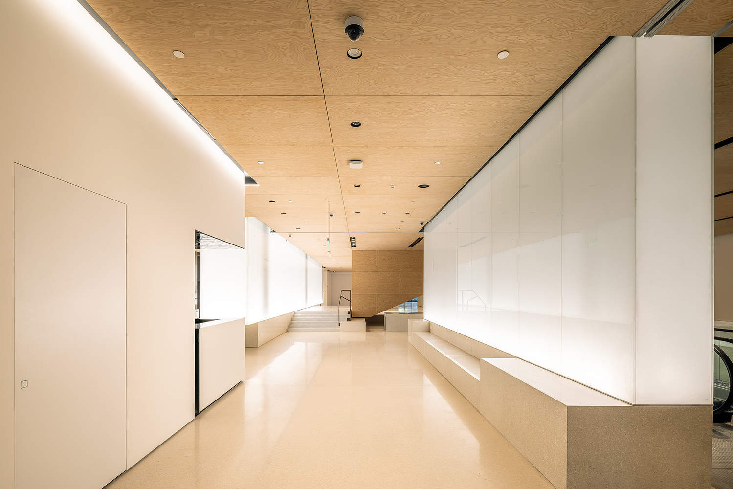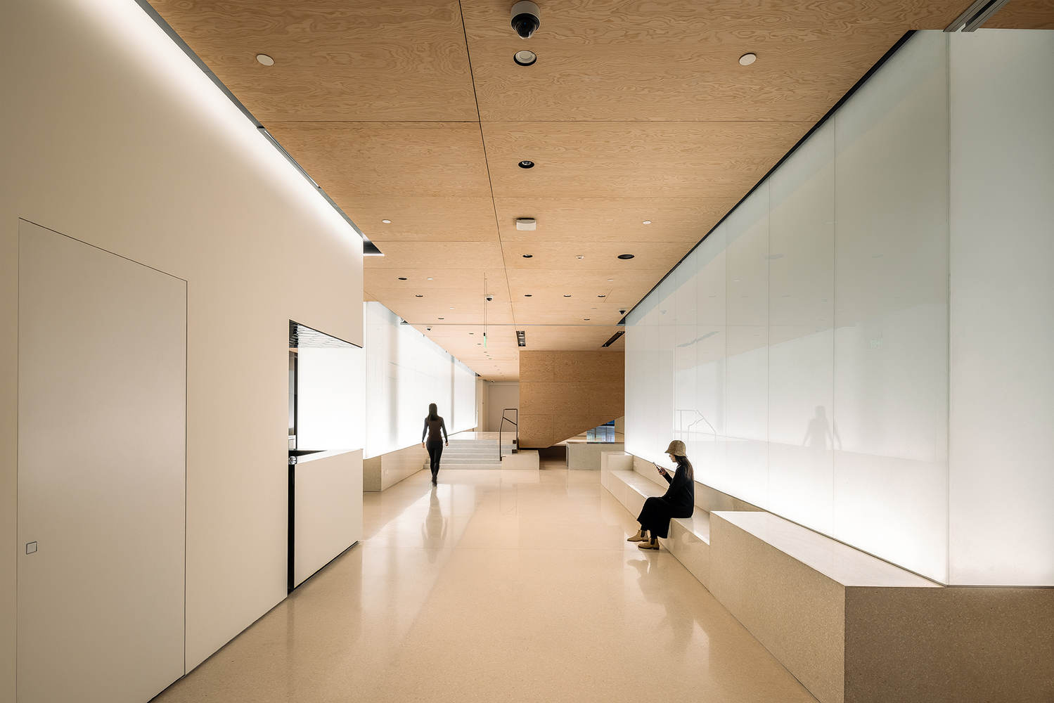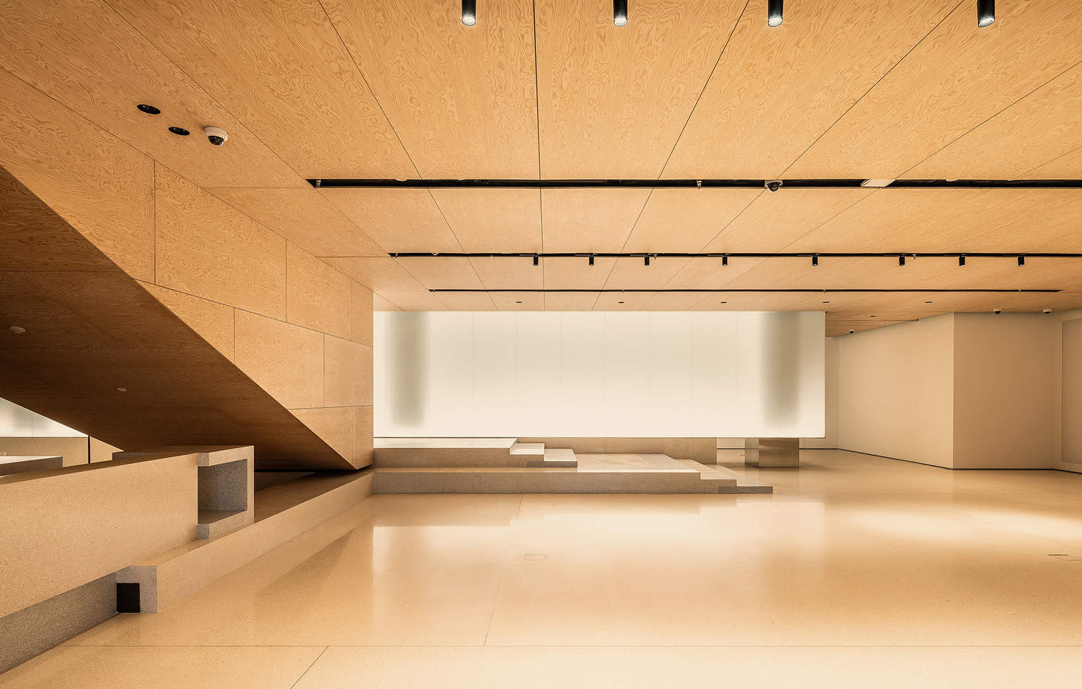 传统与现代融合:材料选择体现了传统工艺与现代生活的完美融合。如旋转切割松木胶合板天花板、柔和色调水磨石地板与中国传统手工纸制成的发光玻璃墙等,经典的北京材料和尖端技术相结合,营造出既熟悉又清新的空间氛围。这种融合不仅展现了对传统文化的尊重,也为现代艺术空间注入了独特的魅力。