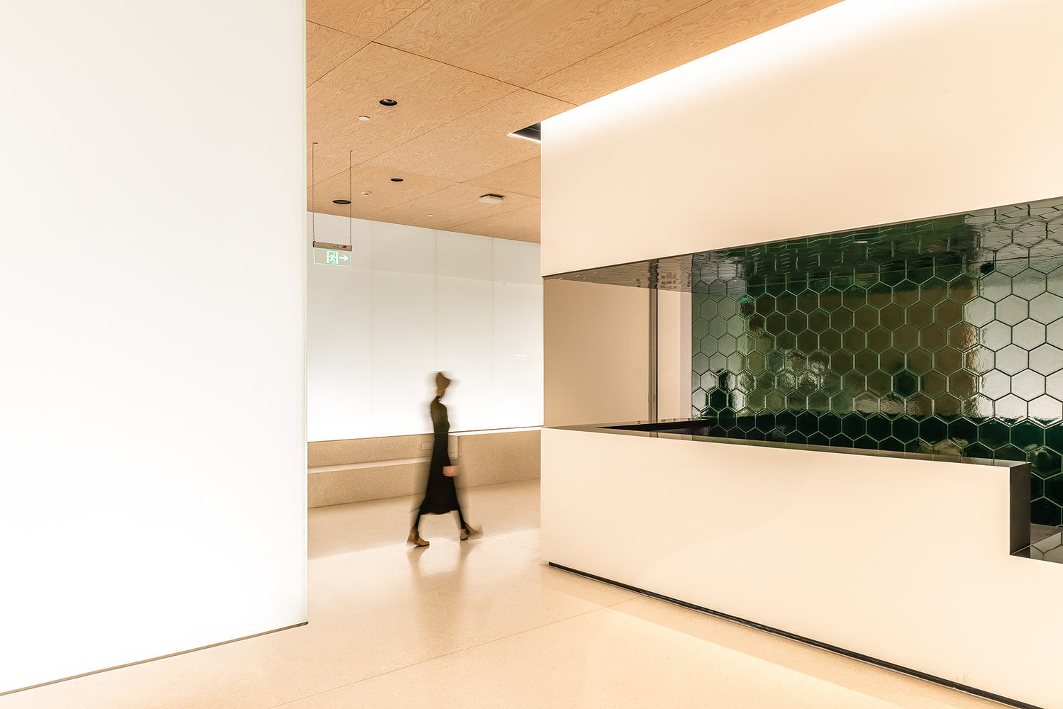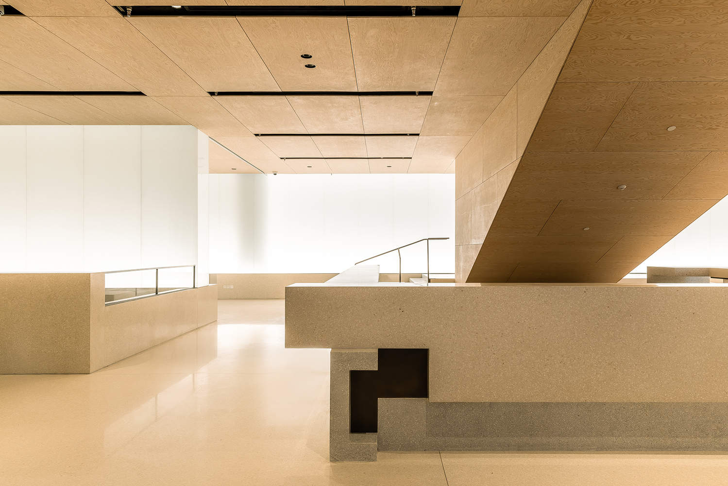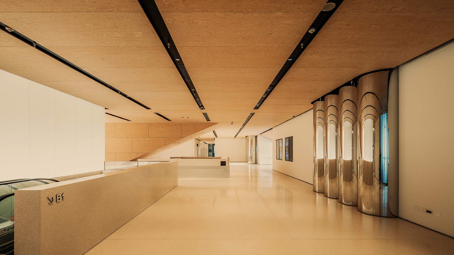 The main lobby has a welcoming and warm ambience, with rotary-cut pine plywood ceiling and soft-toned terrazzo floor. A glowing glass wall made from traditional Chinese handmade paper doubles as both lighting and a space divider. Traditional craftsmanship is infused throughout, with glazed ceramic tiles, custom bronze door handles, interlocking blocks for reception counters, and intricately shaped ventilation panels—all meticulously designed and crafted. An inverted triangular form suspended between ceiling and floor directs visitors up toward the Spiral Gallery.