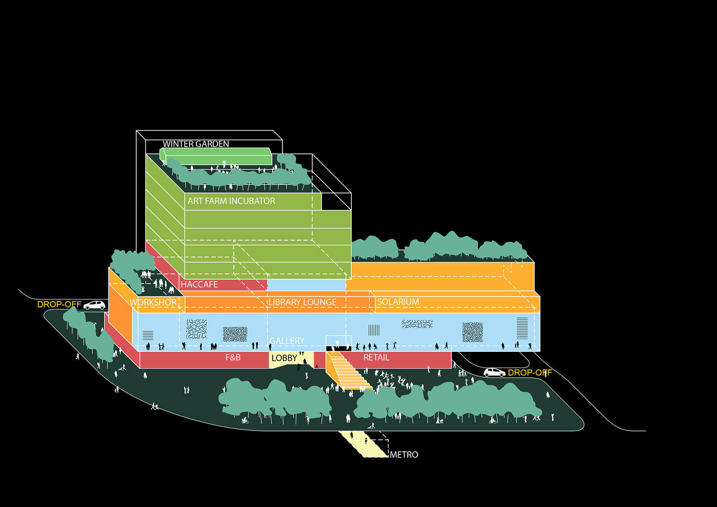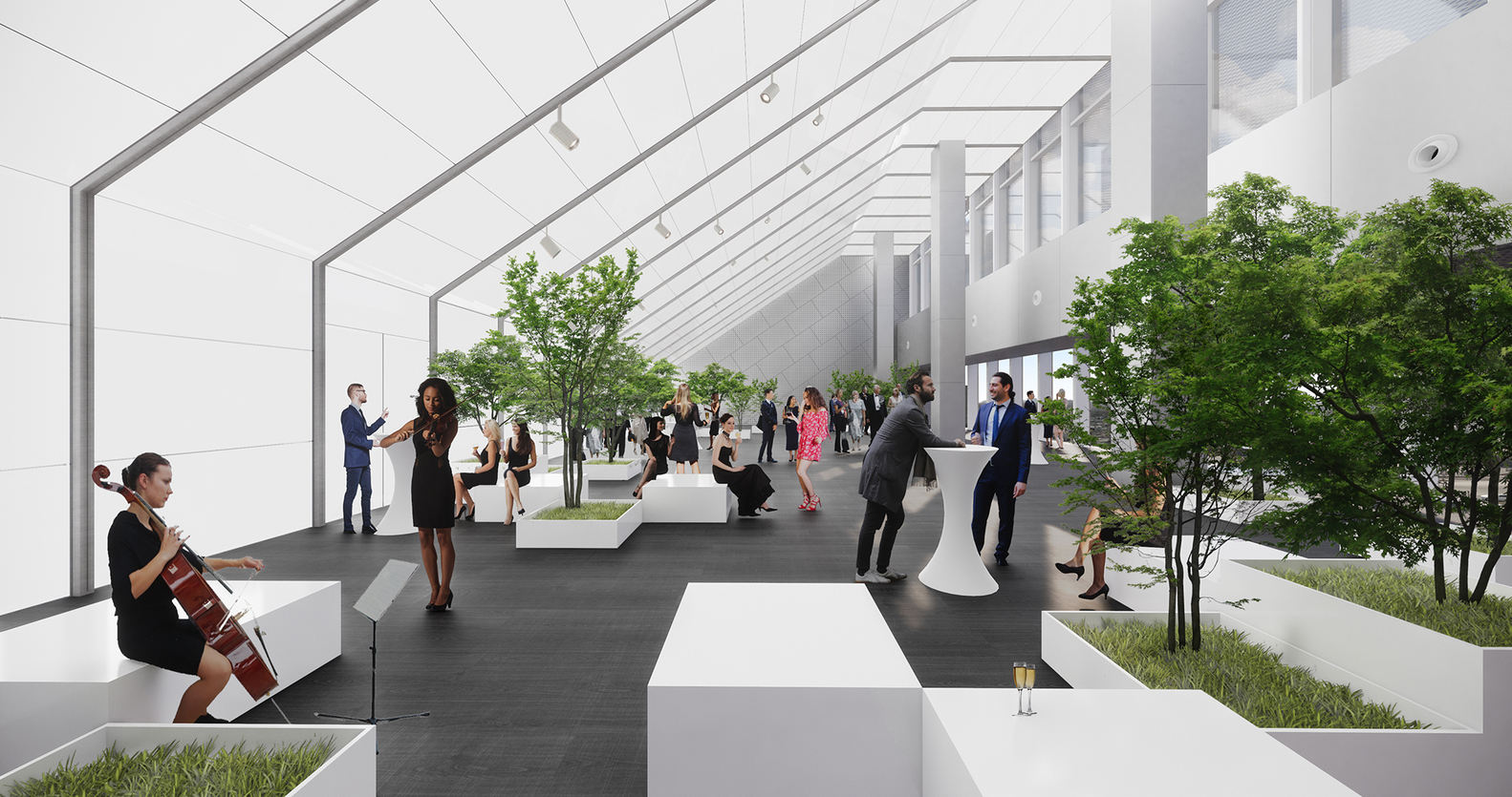 The Solarium on the fourth floor, with its glowing sloped glass roof, is a plant-filled venue for exhibitions and social events. Adjacent is the Library, a rainbow-colored linear space with floor-to-ceiling glass window overlooking the city boulevard. The Art Studio, connected to the Library, serves as a flexible workshop space. The Solarium and all these other ancillary spaces can be used independently or combined to host large events like gala dinners.