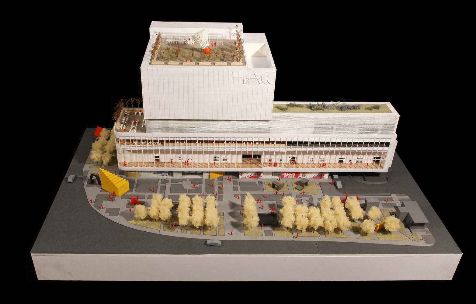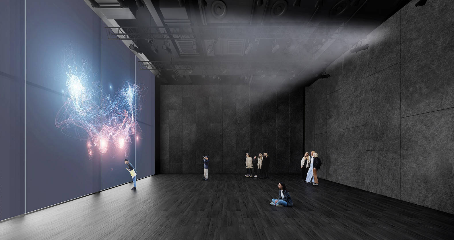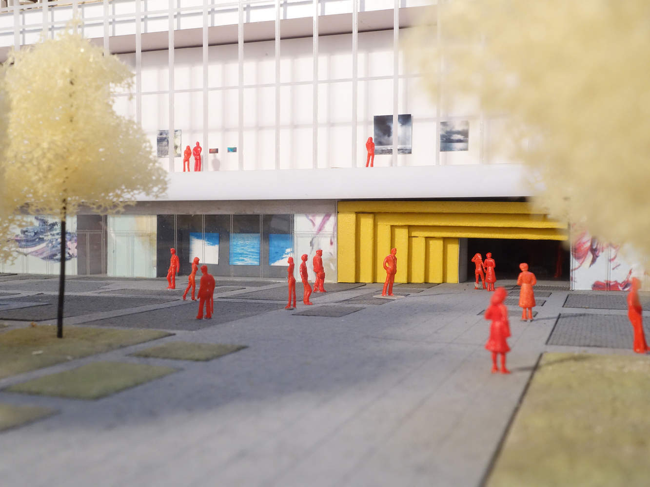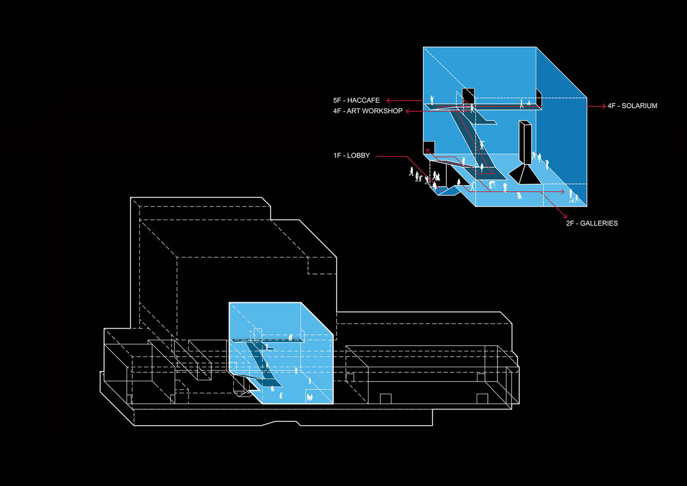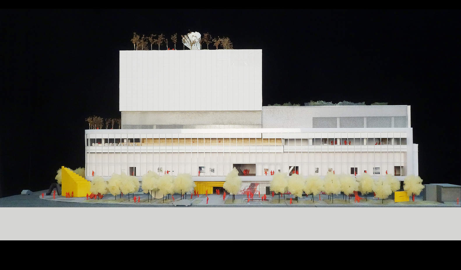 其他现有的电影院被改造成独特的艺术“容器”,以提供多样化的体验。白盒子是一个当代画廊,而Wood Box既是一个展览空间,也是一个表演空间。长廊,前身为100米长、7米高的出口走廊,被改造成一个线性展览空间,通过其落地玻璃立面与城市互动。放映室是一个配备双投影屏幕的多功能黑匣子影院。一个投影供内部使用,另一个通过半透明屏幕向城市展示其内容,将室内活动与城市环境联系起来,并激活周围的公共空间。