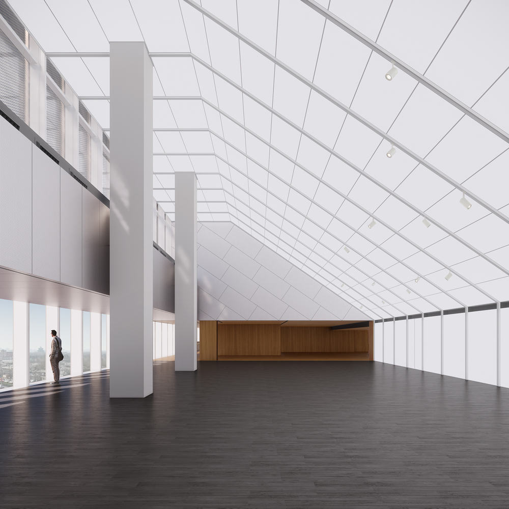 四楼的日光浴室有着发光的倾斜玻璃屋顶,是一个充满植物的展览和社交活动场所。旁边是图书馆,这是一个彩虹色的线性空间,有落地窗,可以俯瞰城市大道。艺术工作室与图书馆相连,是一个灵活的工作室空间。日光浴室和所有其他辅助空间可以独立使用或组合使用,以举办盛大的晚宴等大型活动。