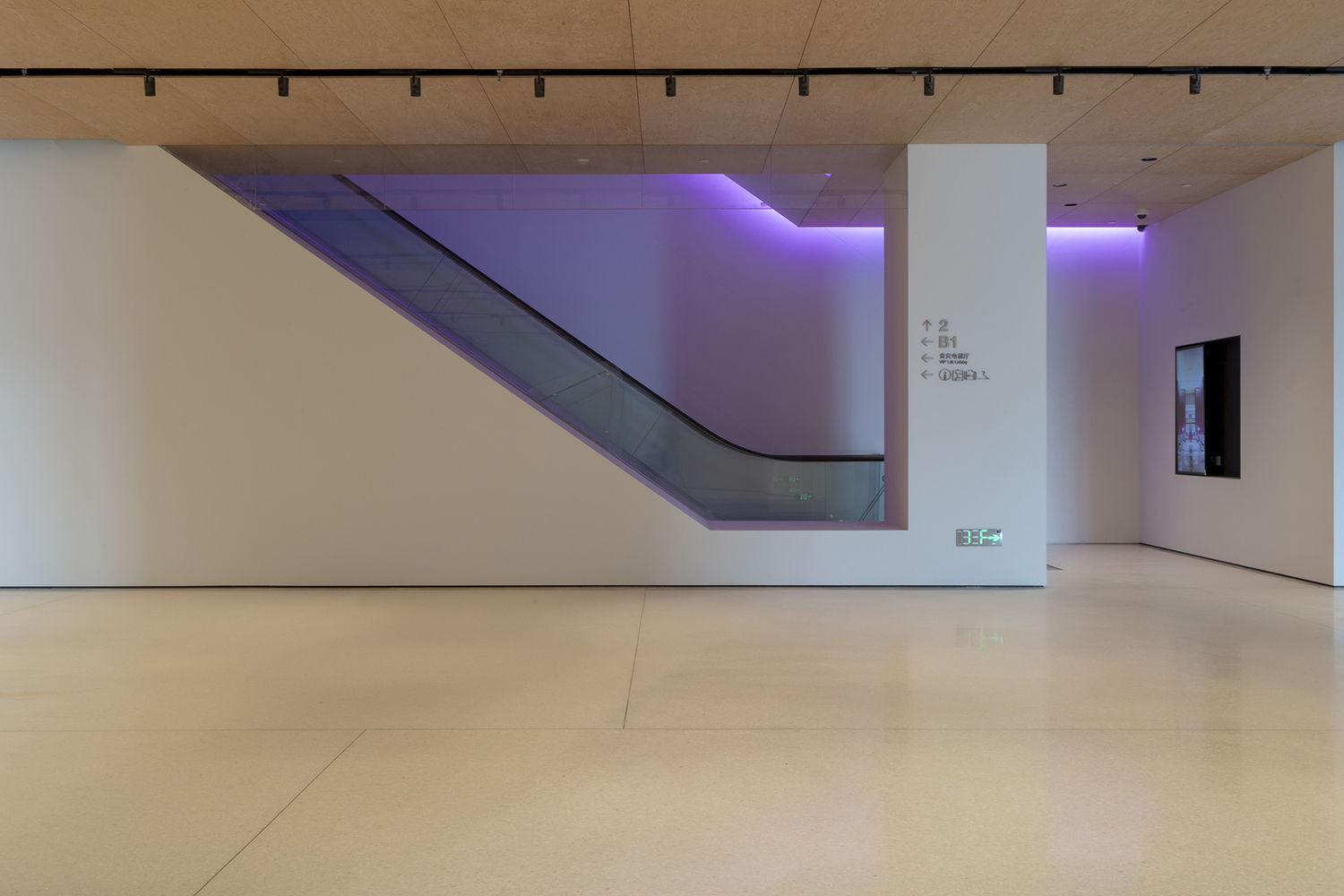 主大厅拥有温馨的氛围,旋转切割松木胶合板天花板和柔和色调的水磨石地板。由中国传统手工纸制成的发光玻璃墙既可以作为照明,也可以作为空间分隔物。传统工艺贯穿始终,有釉面瓷砖、定制青铜门把手、接待台联锁块和形状复杂的通风板——所有这些都经过精心设计和制作。悬挂在天花板和地板之间的倒三角形将游客引向螺旋画廊。