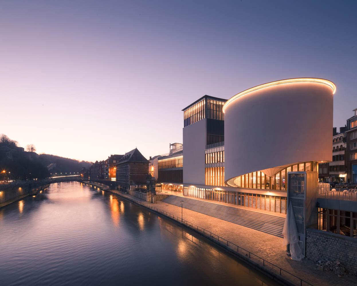 The building - This cultural center sits in the center of Namur, on the north bank of the Sambre River, facing the historic center of the town known as "Le Grognon". Designed by Victor Bourgeois and built at the start of the 1960s, the building required renovation and extension to meet the current requirements of local people and to accommodate the redevelopment of the rue des Bouchers and the banks of the Sambre River. The building used to consist of a 400-seater theatre at one end of a rectangular box-shaped space on four levels with a south-facing curtain wall (looking over the Sambre River) built up against a curved rectangular box-shaped space on five levels, known as the "croissant", which has an east-facing curtain wall and a south-facing end wall which has no openings.