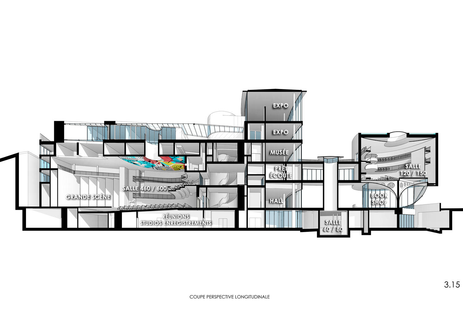 The project shall preserve the existing construction (with the exception of the small buildings annexed to the backstage area and at the site's northwest corner). One intermediate mezzanine was added into the foyer of the 450-seater main theatre, as well as an additional level on top of the "croissant" (level 4), with extensions to accommodate the functionality required.These additions shall include, to the east of the building in front of the "croissant", the "prow cylinder" comprising the reception porch, and significant extensions to the northeast of the building.