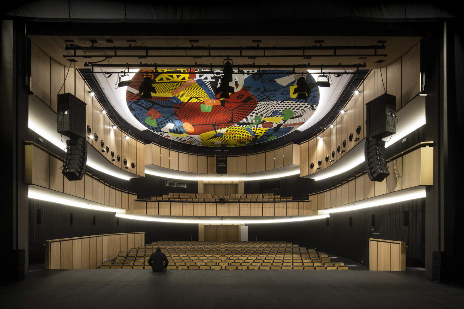 功能性与可持续性:项目充分考虑了各种关键因素,包括消防、无障碍通行以及对环境的尊重。450 座主剧院的屋顶采光设计,既满足了排烟和自然采光需求,又可用于自然通风,体现了功能性与可持续性的完美结合。此外,通过垂直百叶和水平百叶调节自然光照度,以及为剧院舞台设置采光井,进一步提升了建筑的功能性和节能性,符合现代建筑的发展趋势。