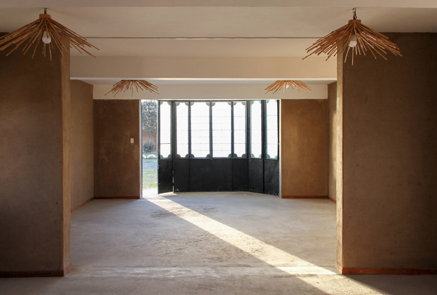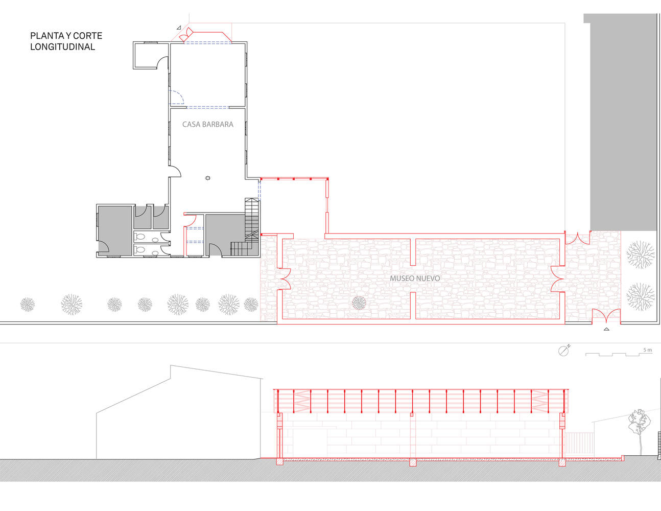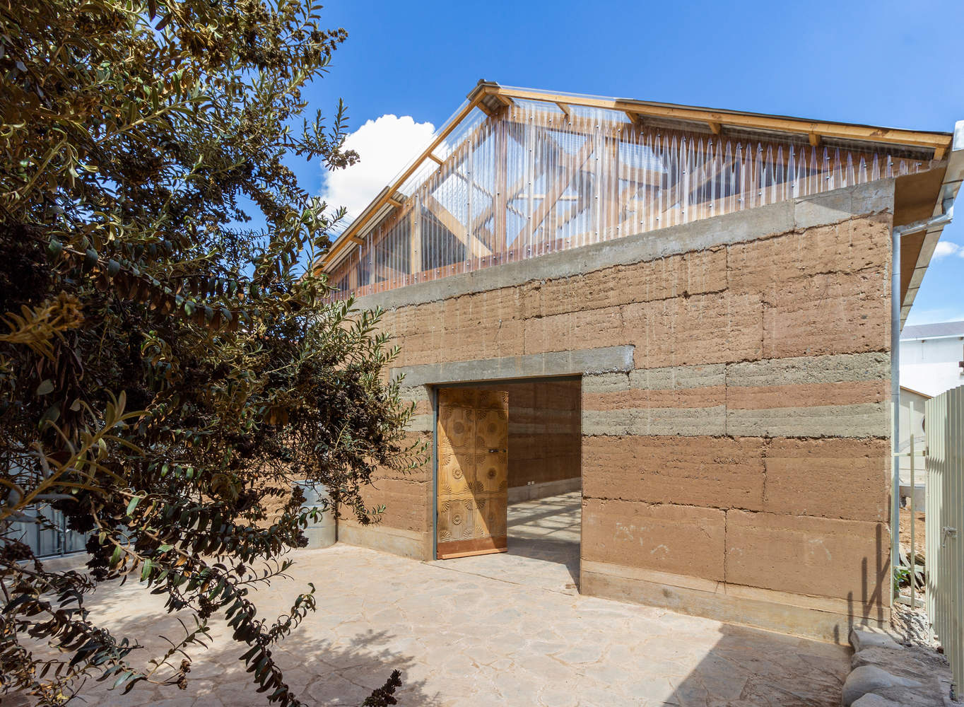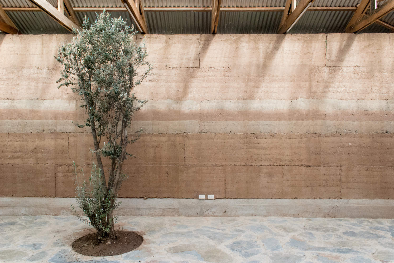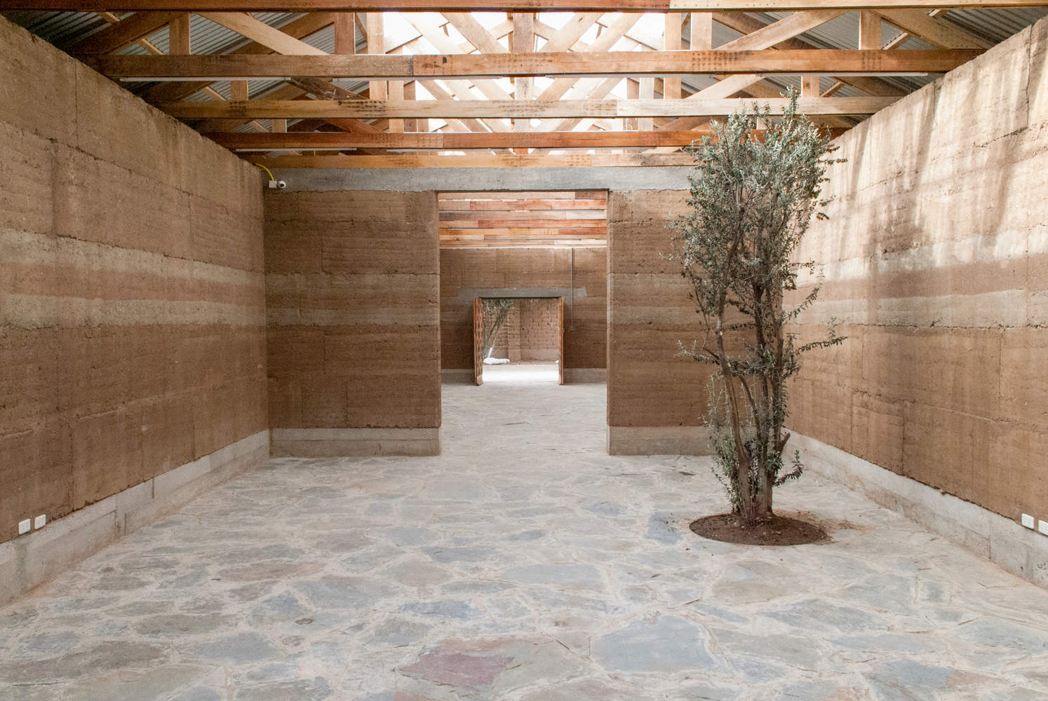 Finally, the tour enters the new block, this space is built entirely with rammed earth walls and has a gable roof composed of exposed wooden trusses. Light enters from above through polycarbonate sheets arranged on both sides of the ridge. This space has two exits that mark a central axis that crosses the space longitudinally. The north exit opens onto a patio where two Kiswaras (Buddleja coriacea Remy), native trees of the Andean highlands, were preserved.