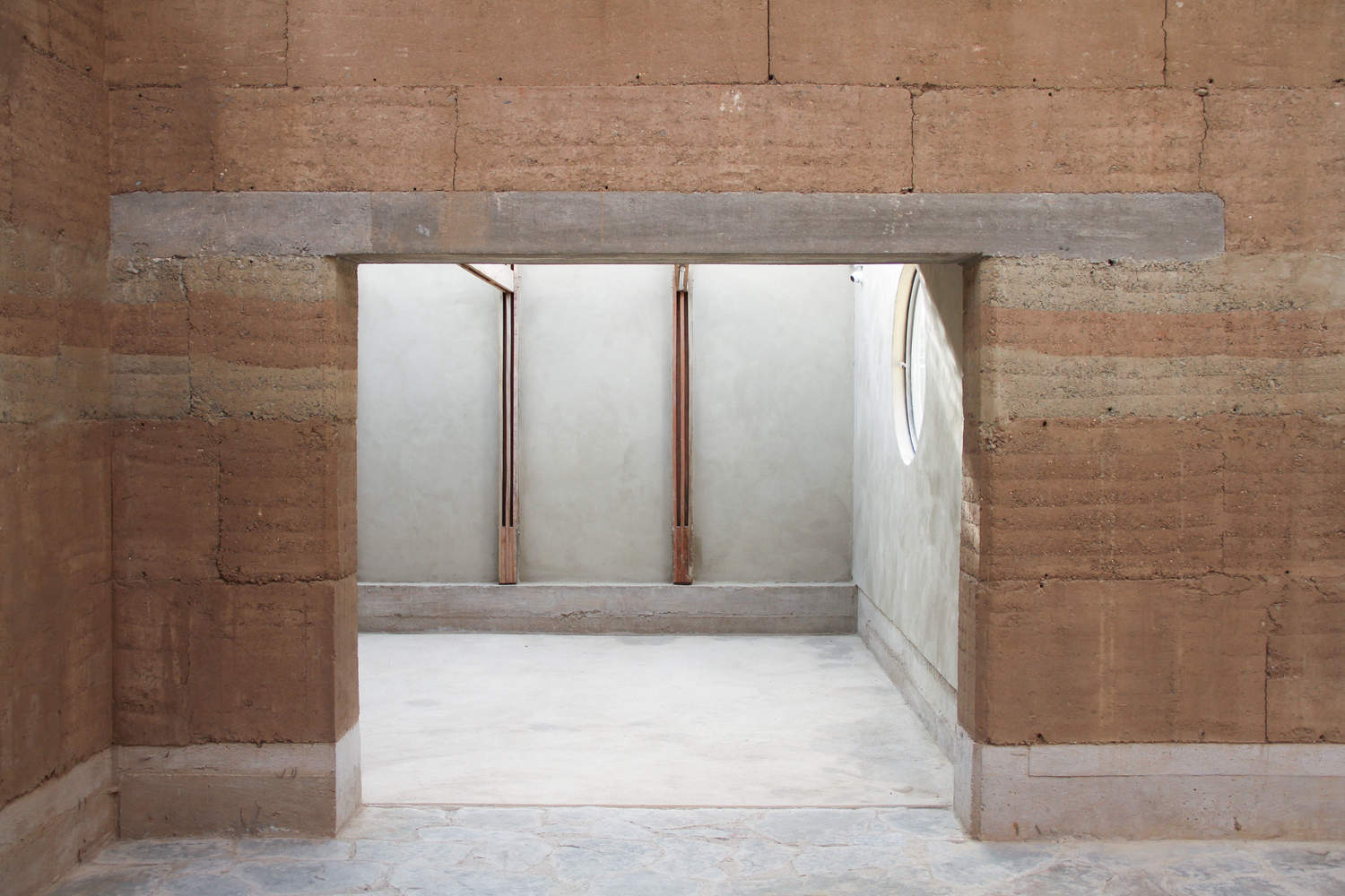 The tour of the museum begins in the existing rooms of the “Casa Barbara”, which have been renovated and adapted internally, applying a new earthen plaster over the existing adobe walls, thus replacing a previous stucco plaster. The tour continues through a smaller space, which is characterized by a light earthen plaster, made with gray earth that was brought from the nearby Achocalla valley, located approximately 10 km from the site.