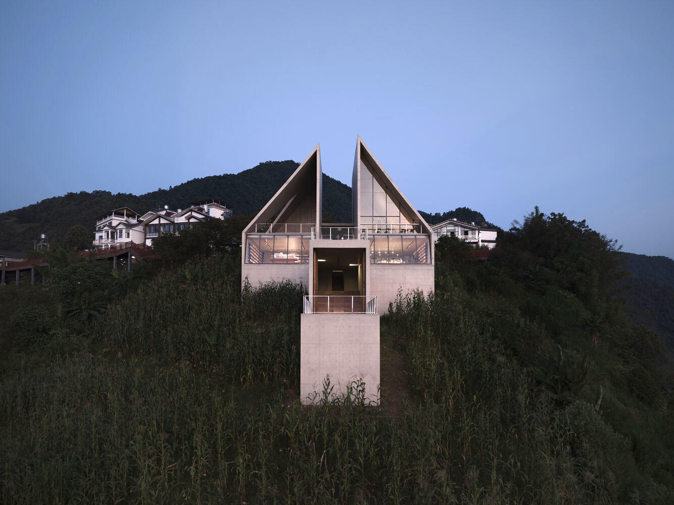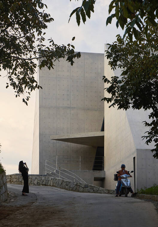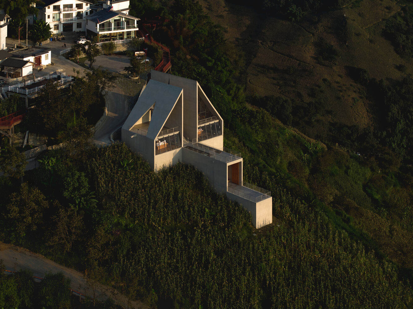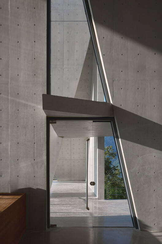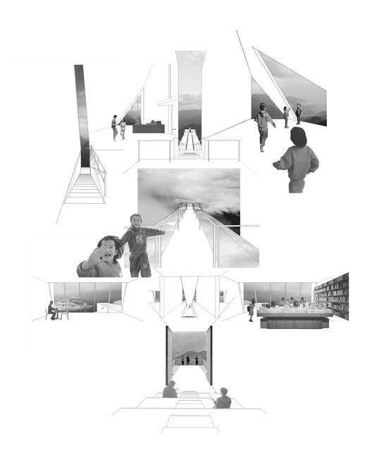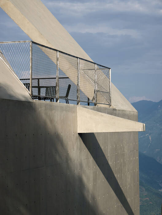 The slanted spaces created by the structure establish a connection with the mountainous environment. Perched on the slope at the village entrance, the building's inclined geometry and steep gradient combine with the site's natural topography to form a dynamic momentum of "an arrow on the bowstring." The exterior walls feature multiple openings oriented in different directions, whose shapes resonate with the building's dynamic form. Each opening frames a unique view of the canyon landscape, through which the building becomes a medium connecting people with the sky and the land.