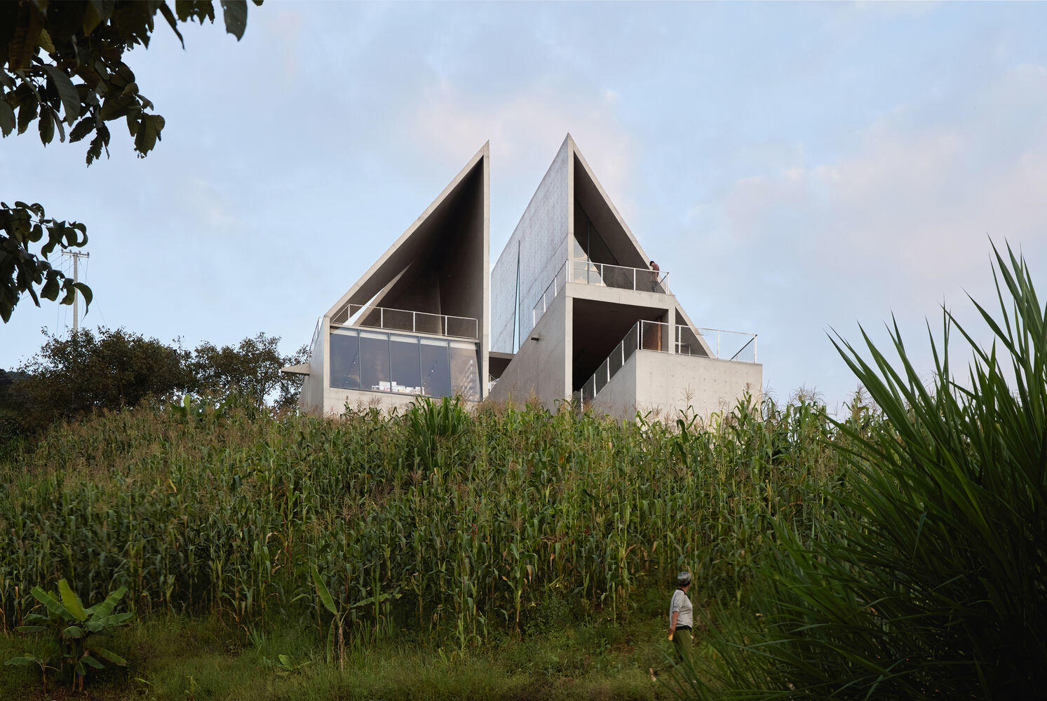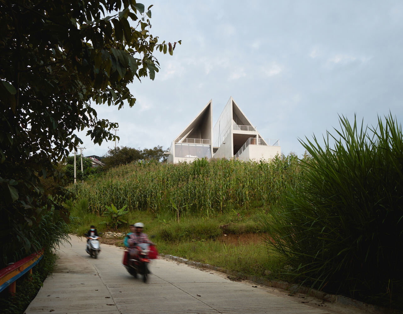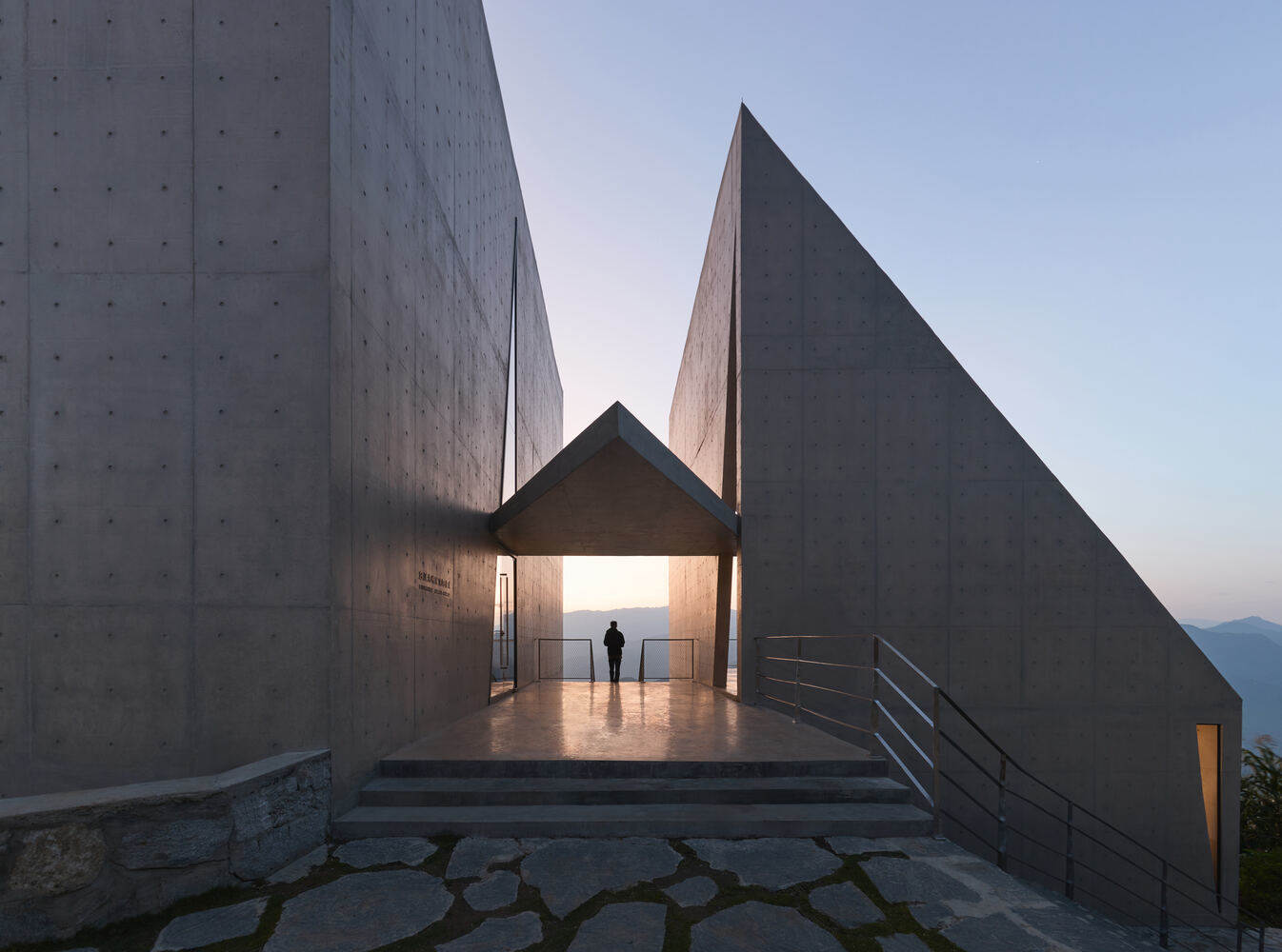 The slanted spaces created by the structure establish a connection with the mountainous environment. Perched on the slope at the village entrance, the building's inclined geometry and steep gradient combine with the site's natural topography to form a dynamic momentum of "an arrow on the bowstring." The exterior walls feature multiple openings oriented in different directions, whose shapes resonate with the building's dynamic form. Each opening frames a unique view of the canyon landscape, through which the building becomes a medium connecting people with the sky and the land.