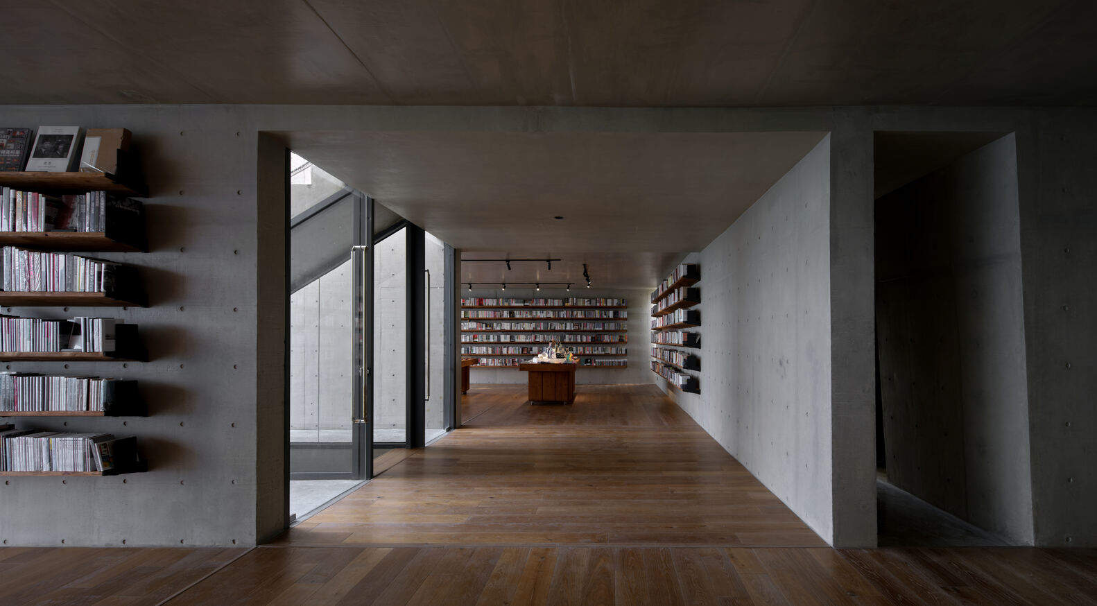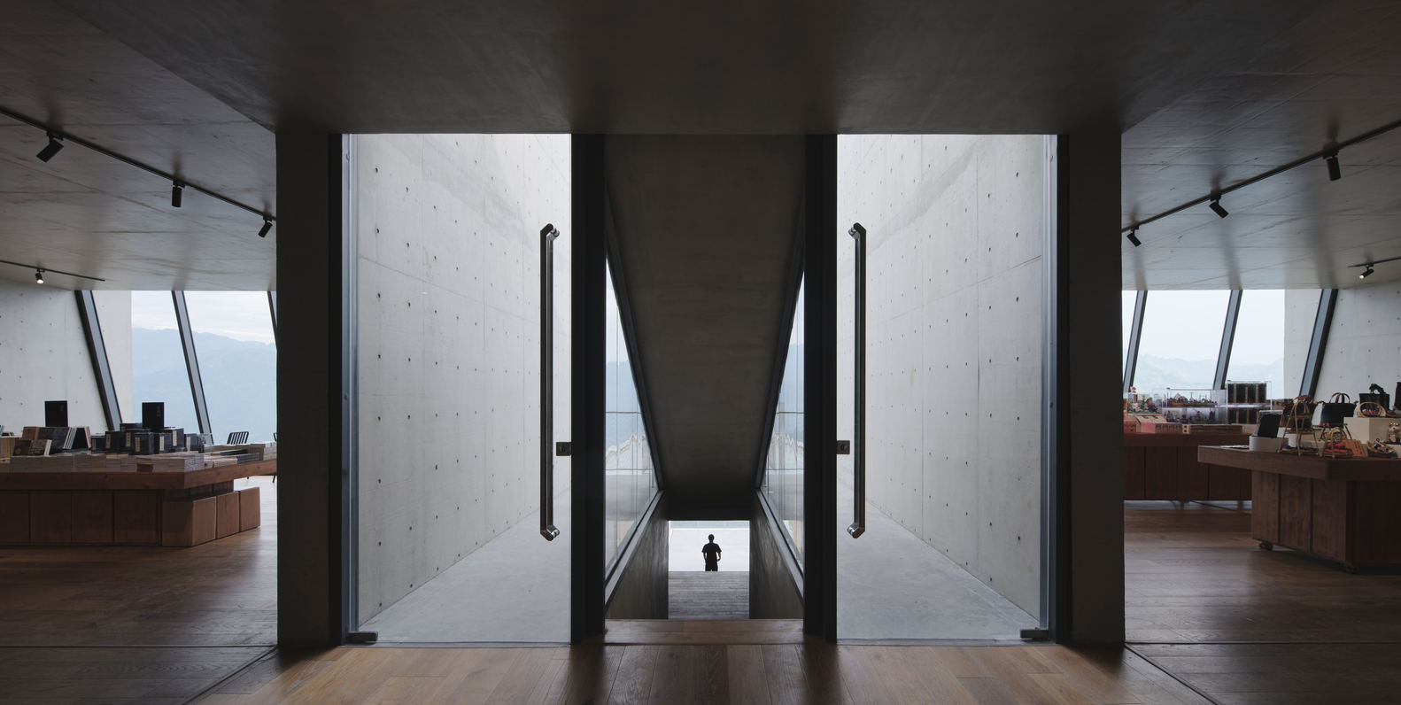 Internal circulation begins at the lofty café on the top, with its sloping roof directed toward the sky, creating a spiritual ambiance. Descending to the mid-level bookstore, visitors are sheltered from nature by heavy concrete walls on three sides. The lower-level theatre is illuminated by two skylights beneath the water surface casting a shimmering light.
