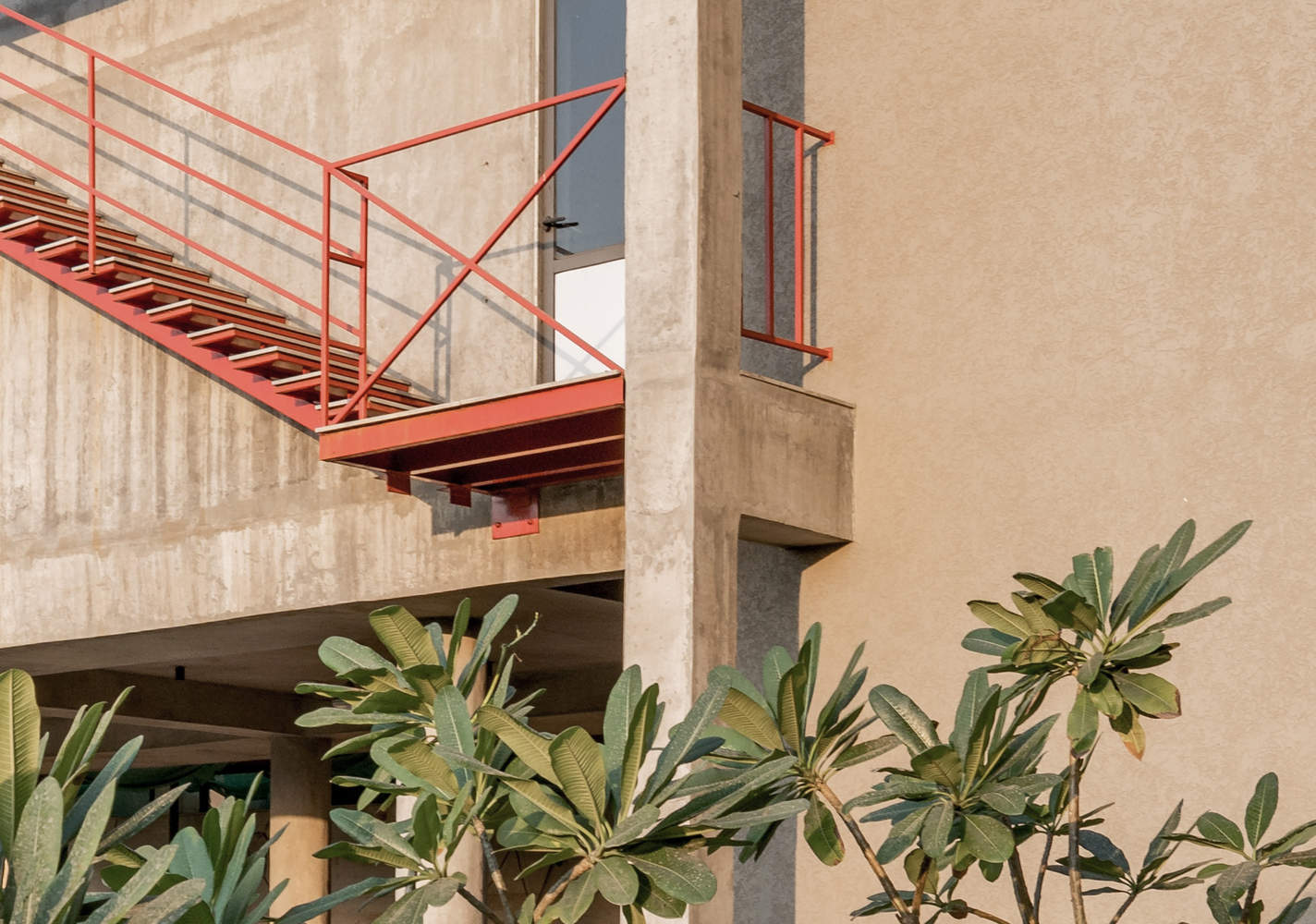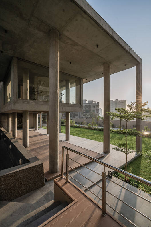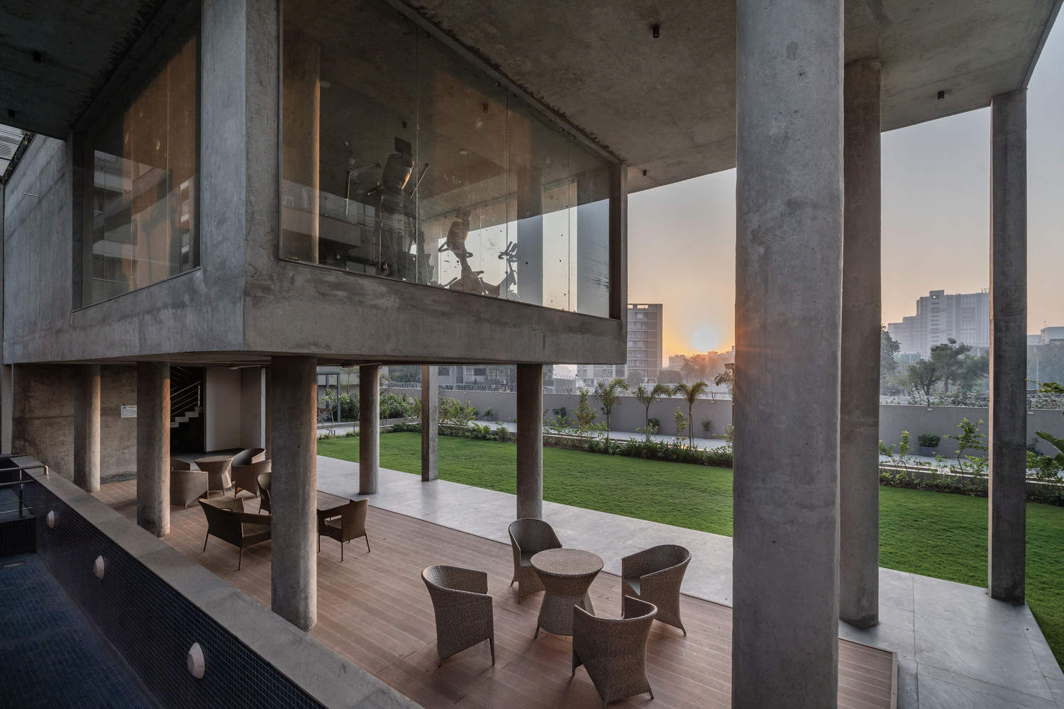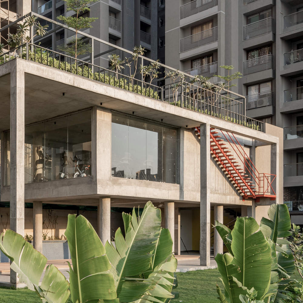 This contrast of mass to void creates an interesting dynamic of space. It accentuates an individual’s experience of seating within the space. Natural Flooring material with an exposed concrete finish is used for the Pavilion. Consciously we have not used any colors for the Pavilion area. Hence, the entire Pavilion seems to merge with the surroundings. It is only the greens of the Tree canopy, Shrubs, and the Lawn area that one perceives while being in the Pavilion space or moving around it. Blue mosaic is used for the pool area. The staircase is designed as an element. The color is bright to create a striking contrast with the exposed concrete finish of the Pavilion façade.