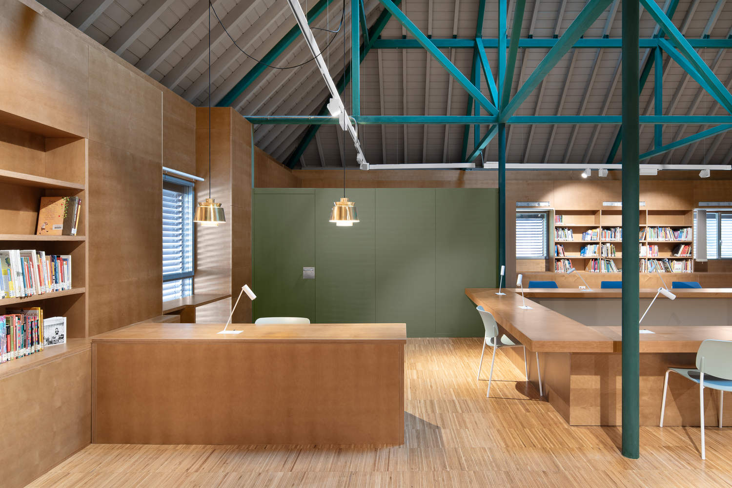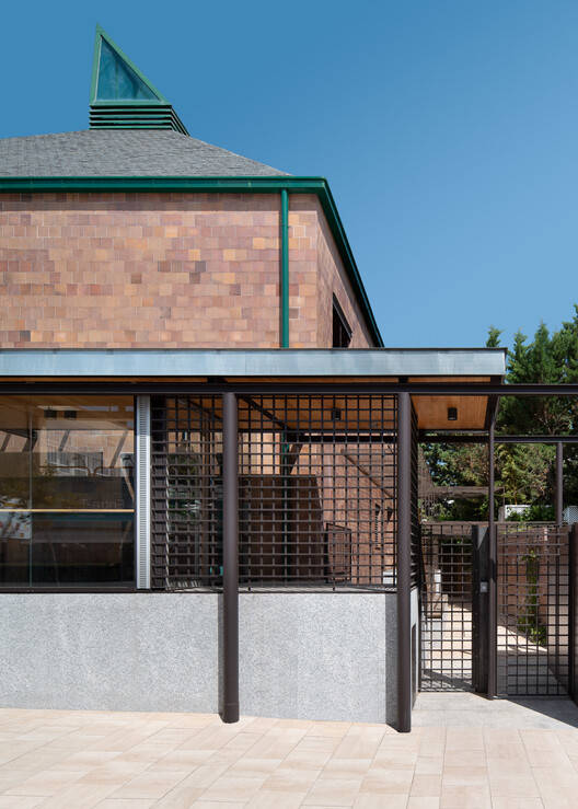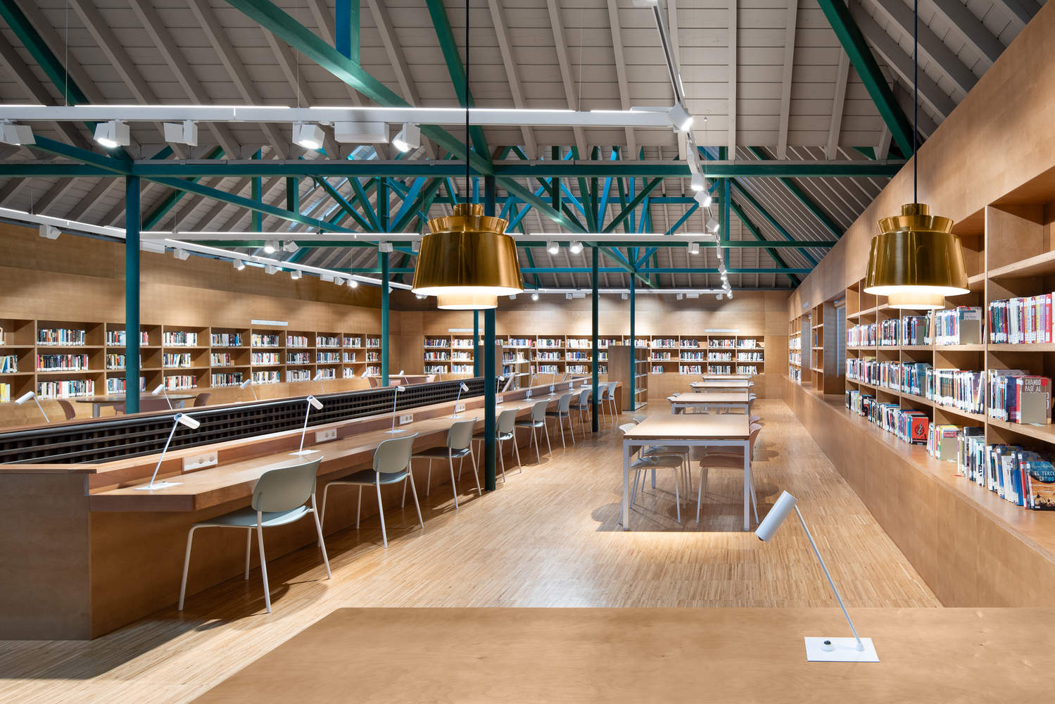 The elimination of partition walls and in particular the structure of the roof of the house prevented the vision of the covering structure, achieving the desired spatial clarity. The scarce natural lighting provided by the skylights, also mitigated by the dark tint of the wood, was alleviated by opening new openings in the longitudinal enclosure oriented to the from interior patio, thus providing a level of lighting in line with its new use as a meeting space. reading. Motorized carpentry was installed in the skylights to facilitate ventilation of the under-deck space.