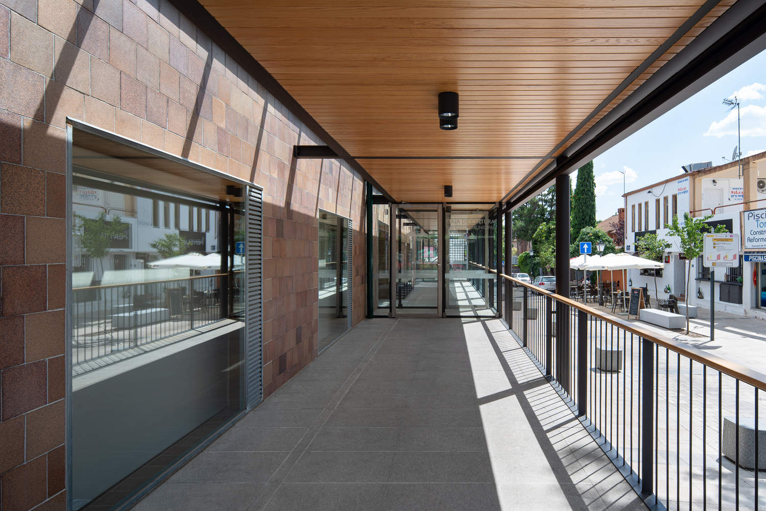 Partially taking advantage of the supports of the existing pergola structure on the exterior perimeter of the building, a glazed gallery has been created that acts as a portal or hallway to the library, which also acts as a filter between it and the outside space.