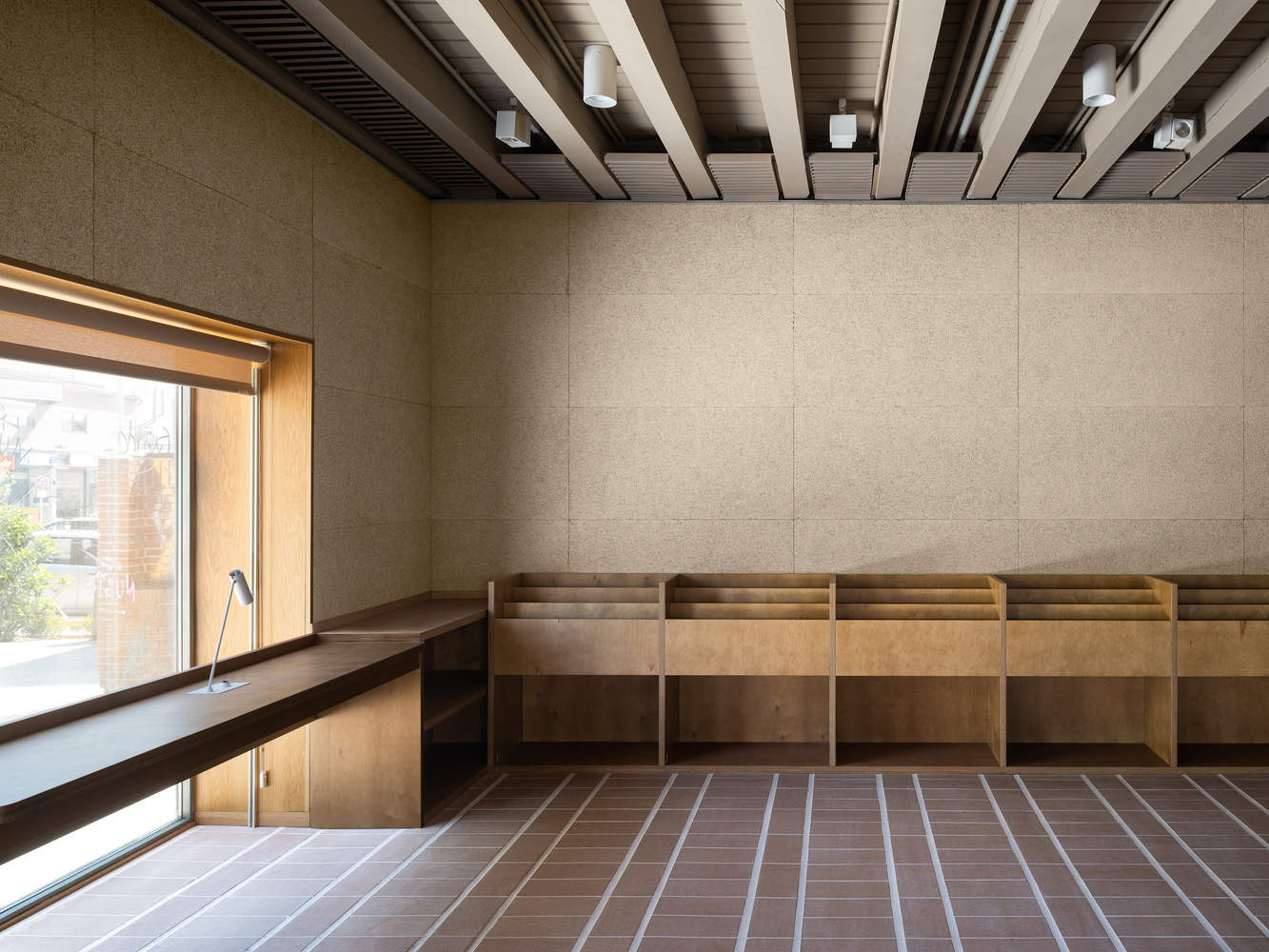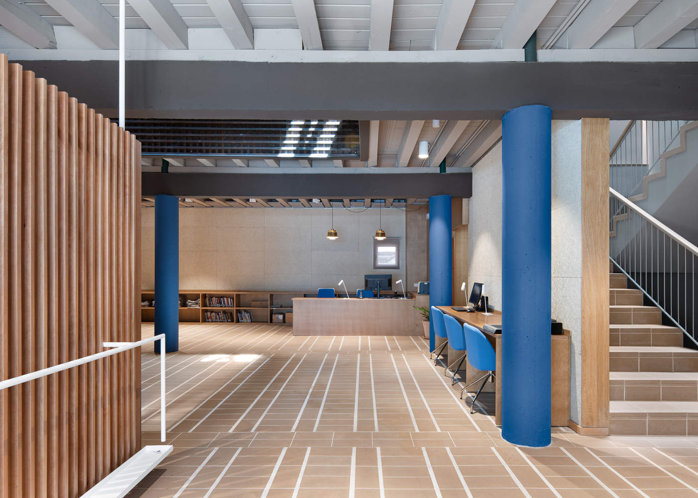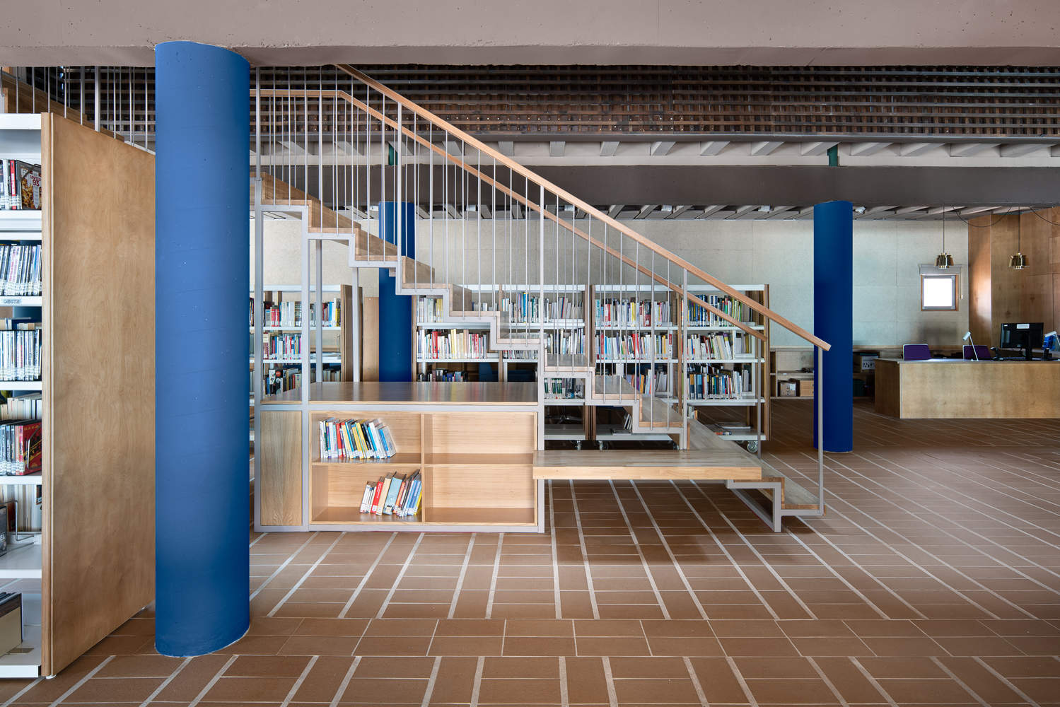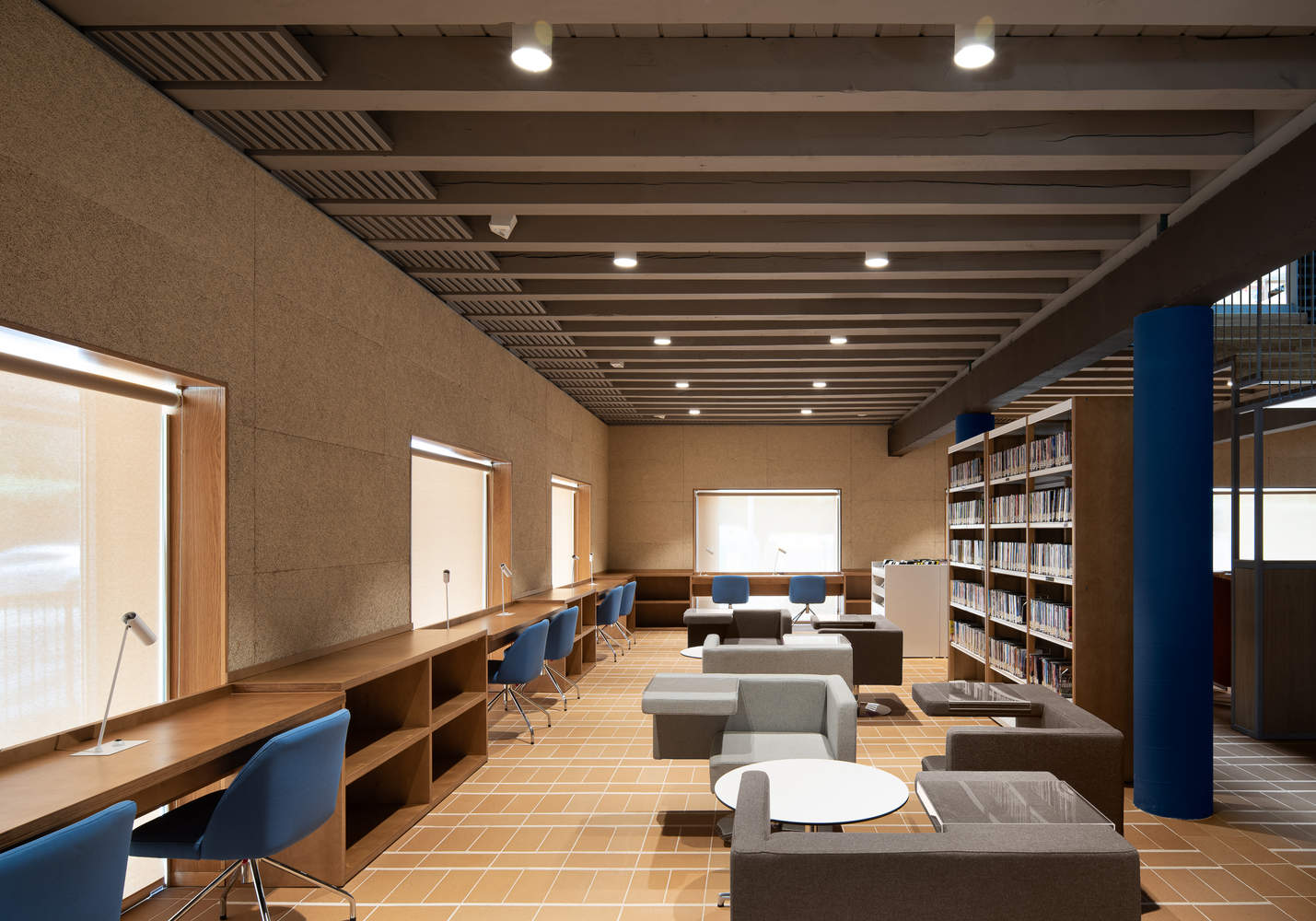 The air conditioning installation was arranged around the perimeter of the building, leaving the ducts hidden by panels and shelves serving the reading space.