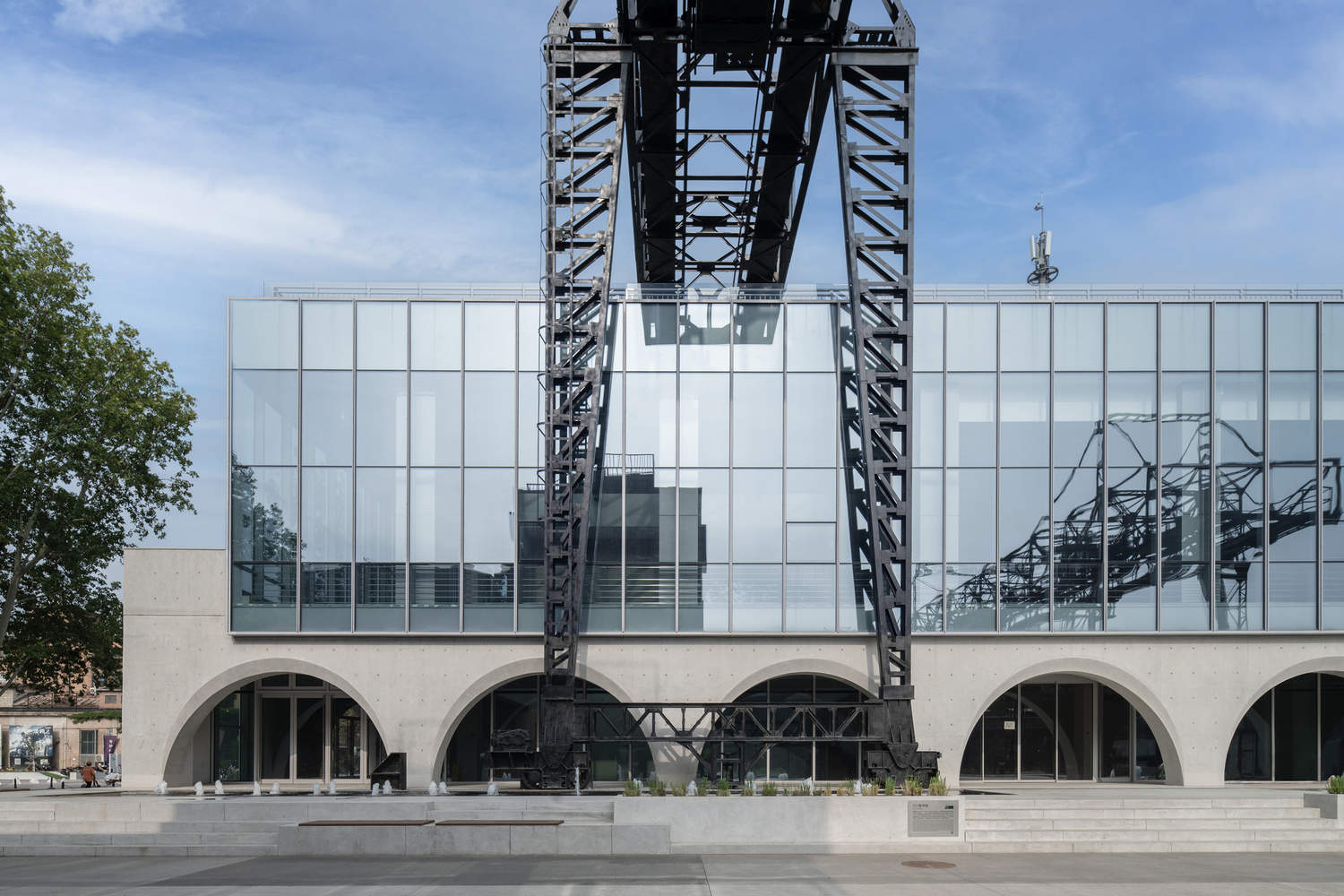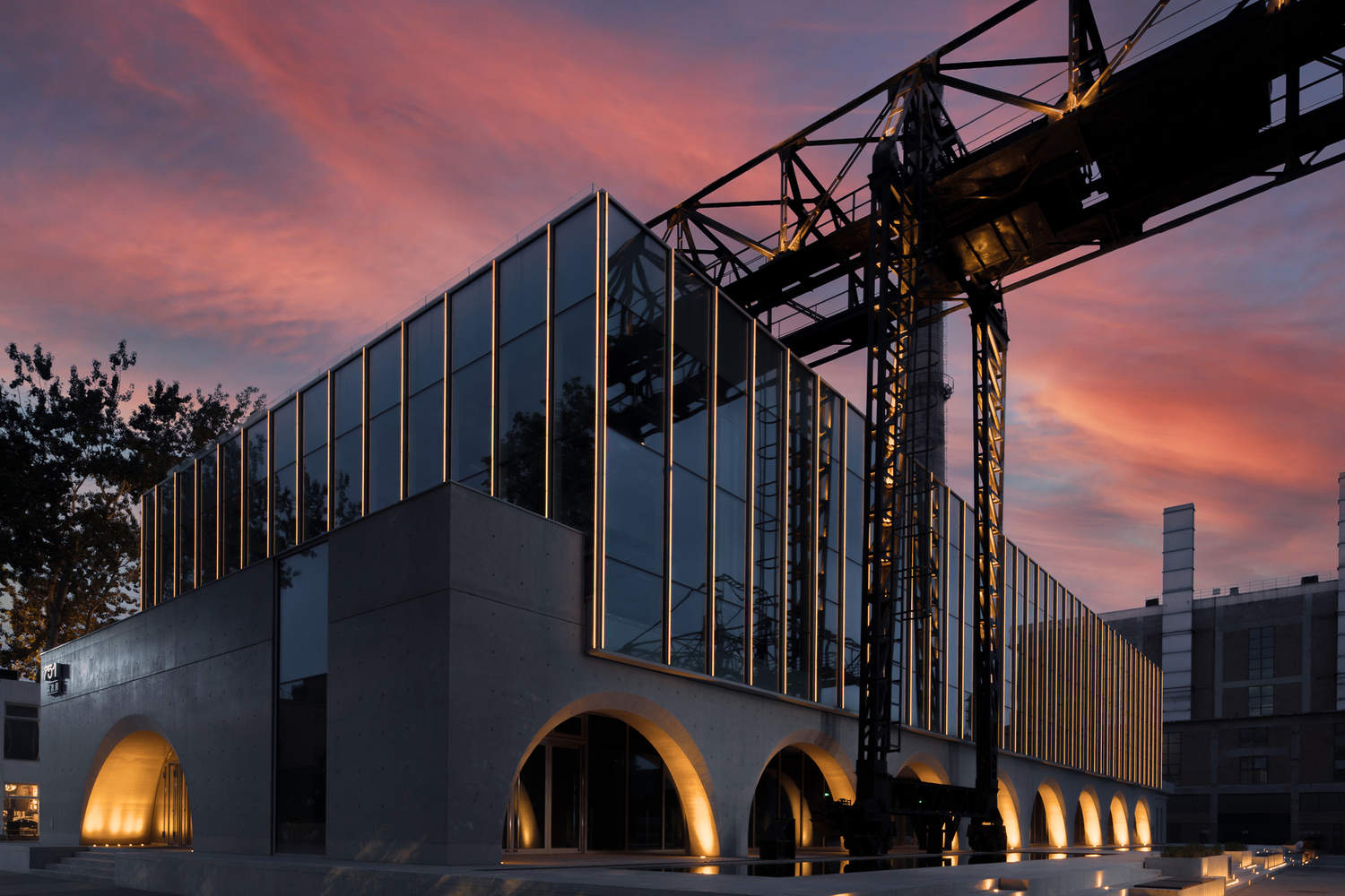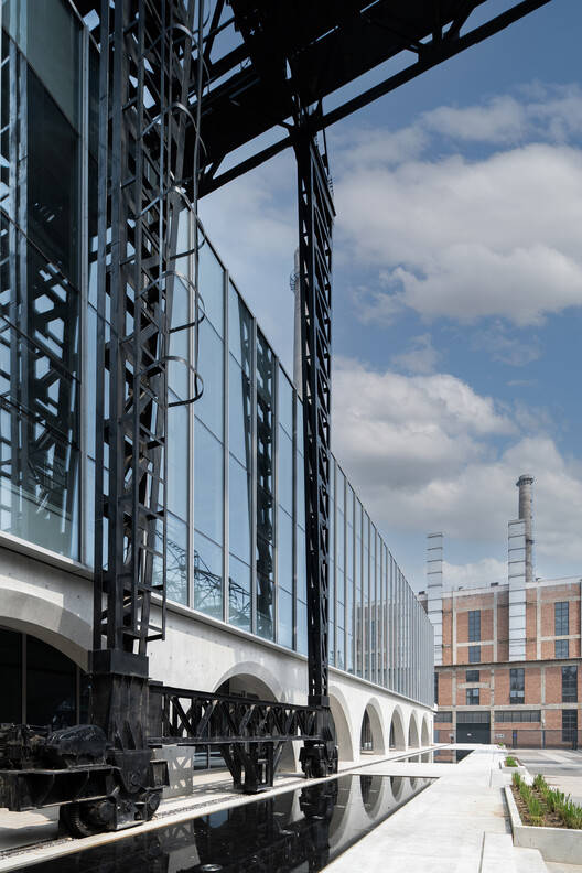 立面以连续的清水混凝土拱门为特色,与附近粗糙的工业遗迹形成鲜明对比。一台保存完好的桥式起重机被整合到建筑中,创造了一个独特的建筑形象,并通过其运动与屋顶形状的空间相互作用。玻璃幕墙和大型天窗将壮观的室外工业景观引入室内,同时与建筑立面形成倒影,创造出美妙的空间对话。室内设计旨在通过开放底层的一半来最大限度地提高空间的开放性,创造一个三层楼高、几乎完全透明的空间。外部丰富的工业景观最大限度地渗透到内部,在紧凑的空间内重新组织,产生意想不到的戏剧性效果。