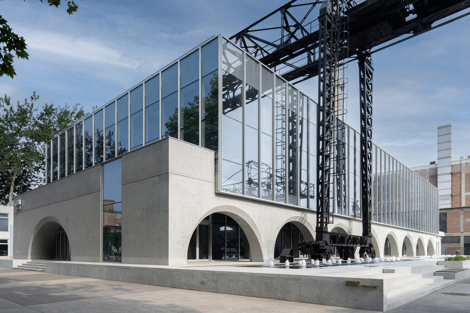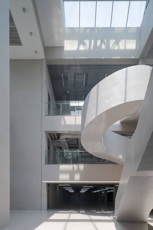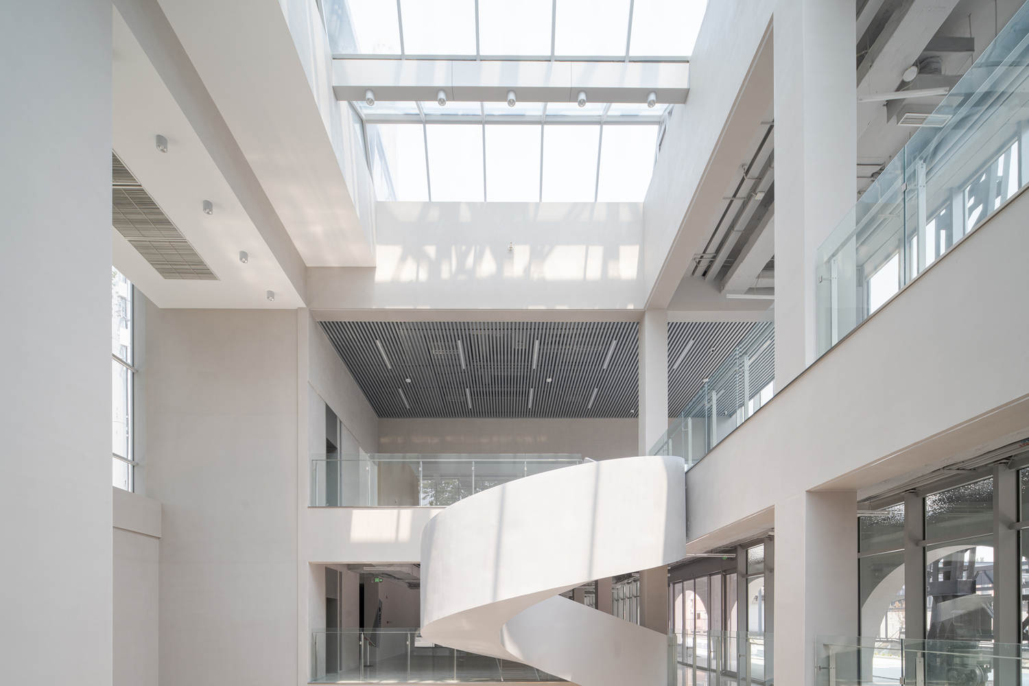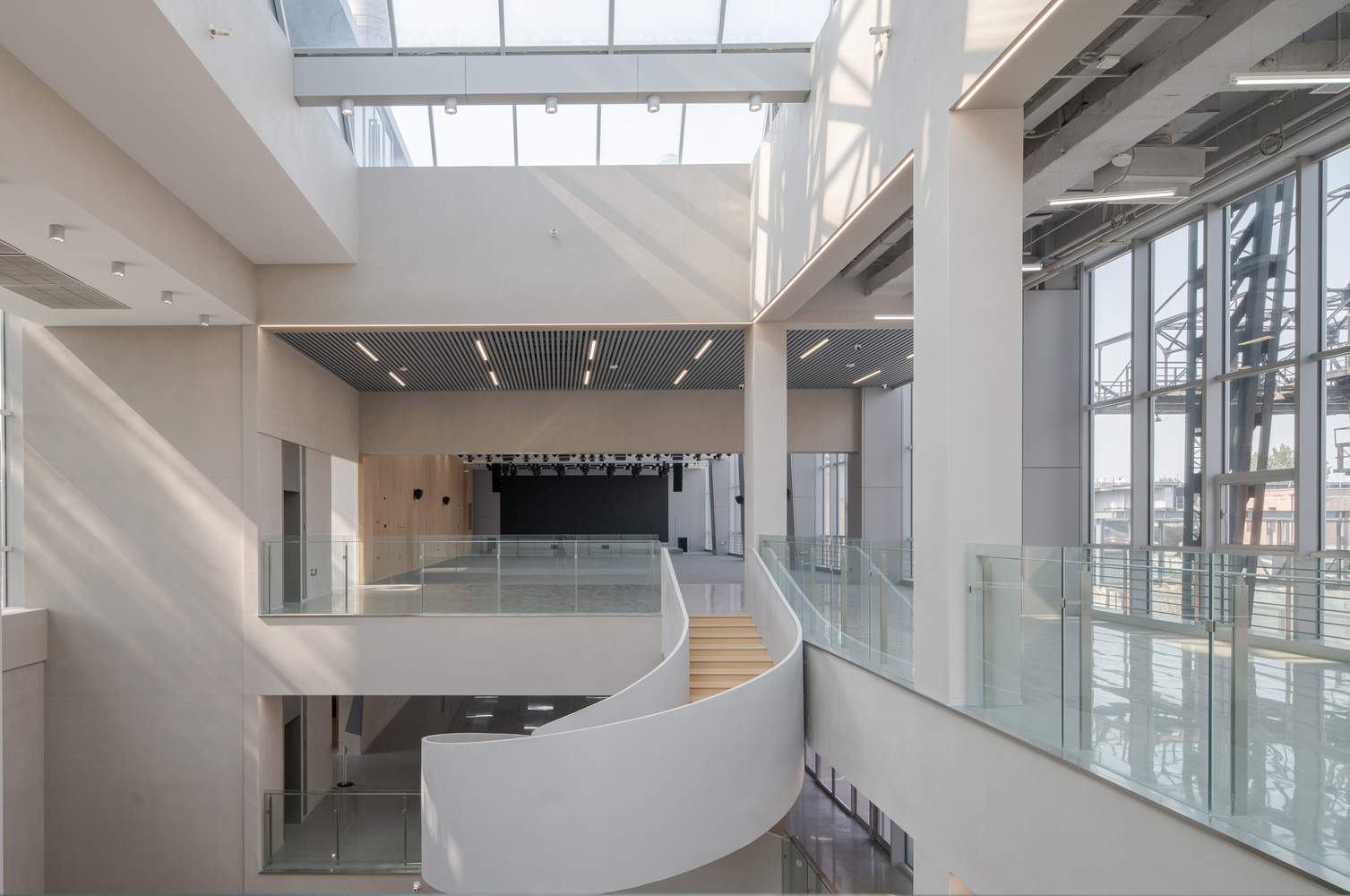 The facade features continuous fair-faced concrete arches that contrast with the rough industrial remnants of the neighborhood. A preserved overhead crane is integrated into the building, creating a unique architectural image and interacting with the roof-shaped space through its movement. The glass curtain wall and large skylights introduce the spectacular outdoor industrial landscape into the interior, while forming reflections with the building facade, creating a wonderful spatial dialogue. The interior design aims to maximize spatial openness by opening up half of the ground floor, creating a three-story, nearly fully transparent space. The rich industrial landscape outside penetrates into the interior to the maximum extent, reorganized within a compact space to produce an unexpected dramatic effect.