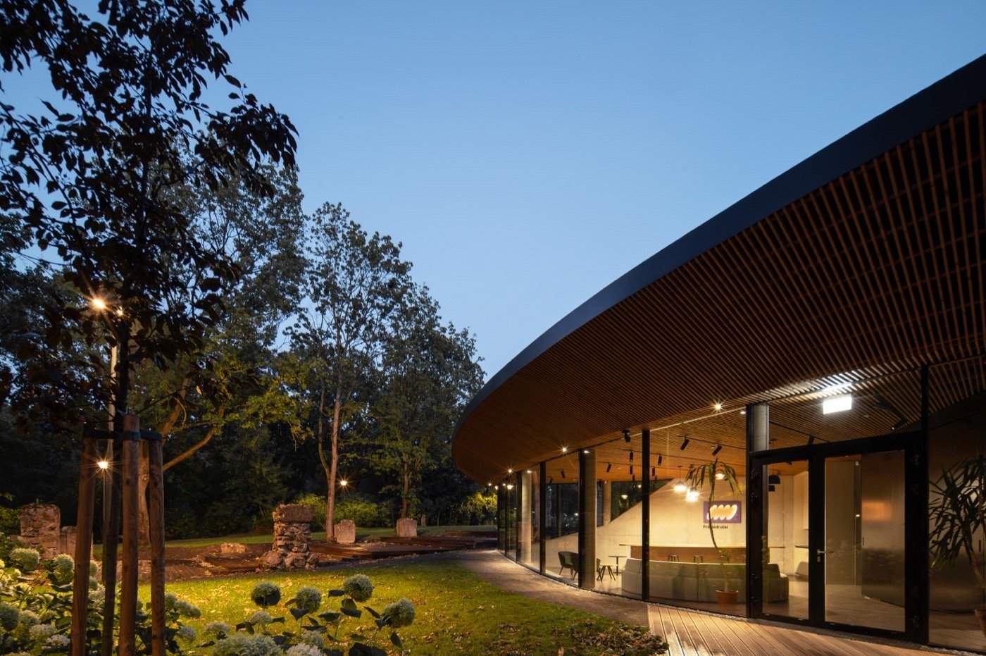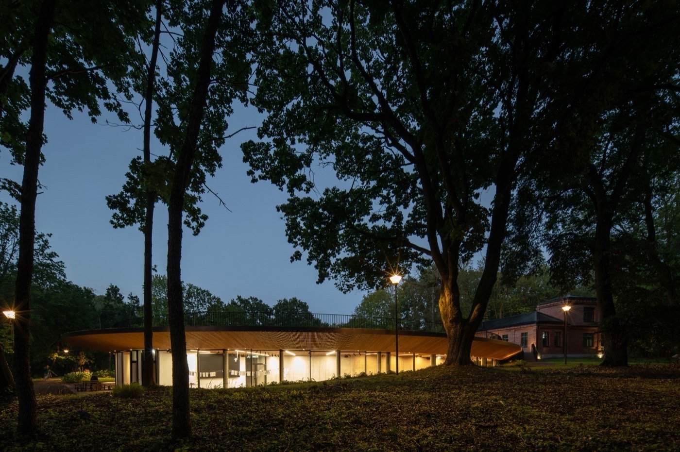 The historic homestead, a red brick heritage building, became a key attraction. It was renovated and expanded with a modern glass extension housing workshops and residencies, blending with the surrounding landscape. The area around the arts center is used for community events, with wooden terraces hosting readings, concerts, fairs, and exhibitions. One terrace is built on the former manor barn site, incorporating its ruins and original masonry. Gardens and orchards are maintained by local citizens.