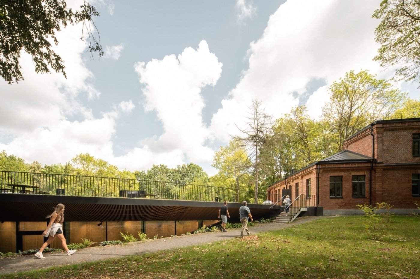 历史与现代的融合:斯卡斯卡尔尼斯公园巧妙地将19世纪末的历史庄园与现代设计相结合。红砖遗产建筑经过翻修和扩建,新增的现代化玻璃扩建房屋车间和住宅与周围自然景观完美融合。艺术中心周围的区域成为社区活动的中心,木制露台举办各类文化活动,而花园和果园由当地居民维护,这种设计不仅保留了历史的韵味,又赋予了公园新的活力和功能。