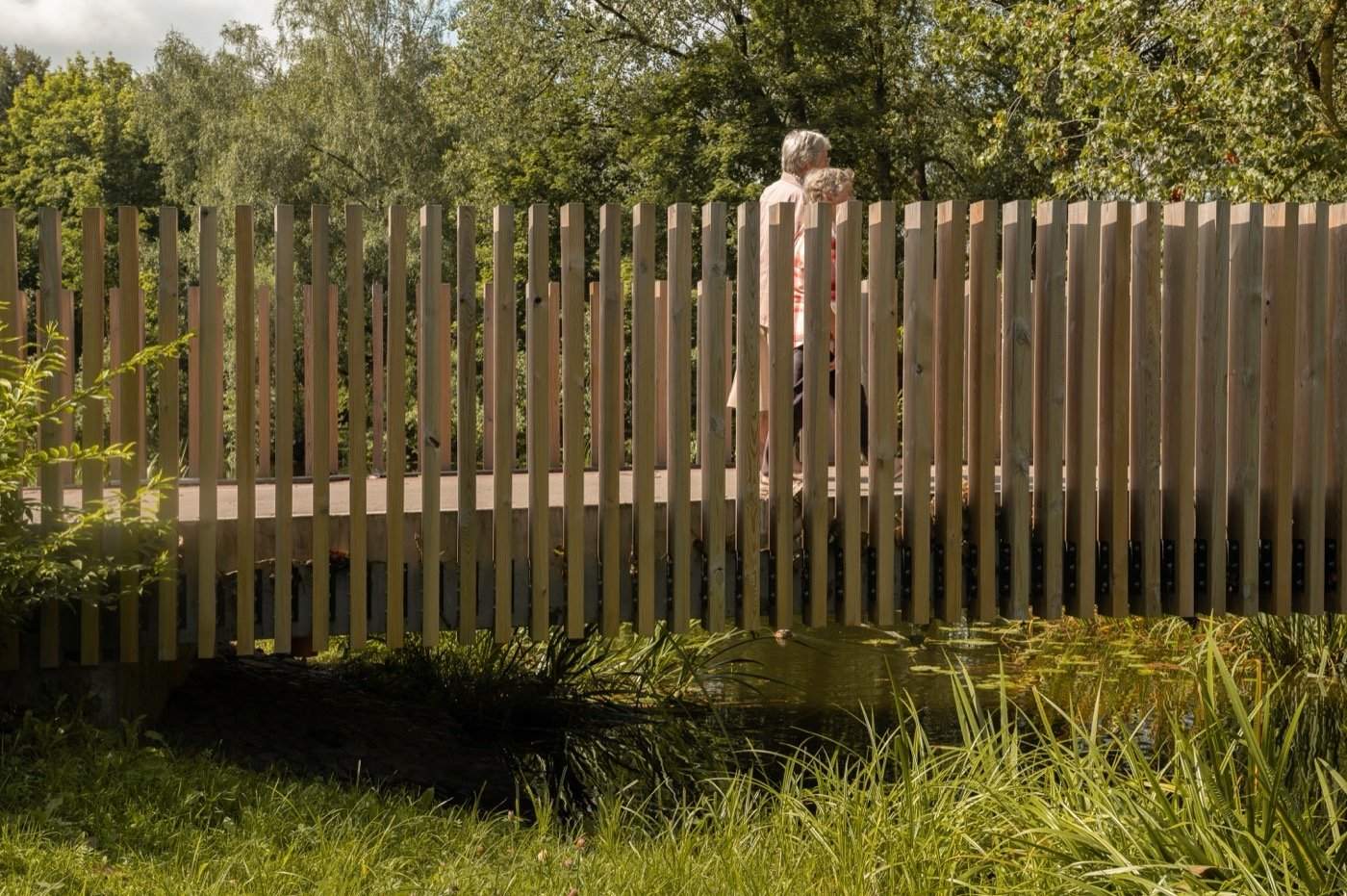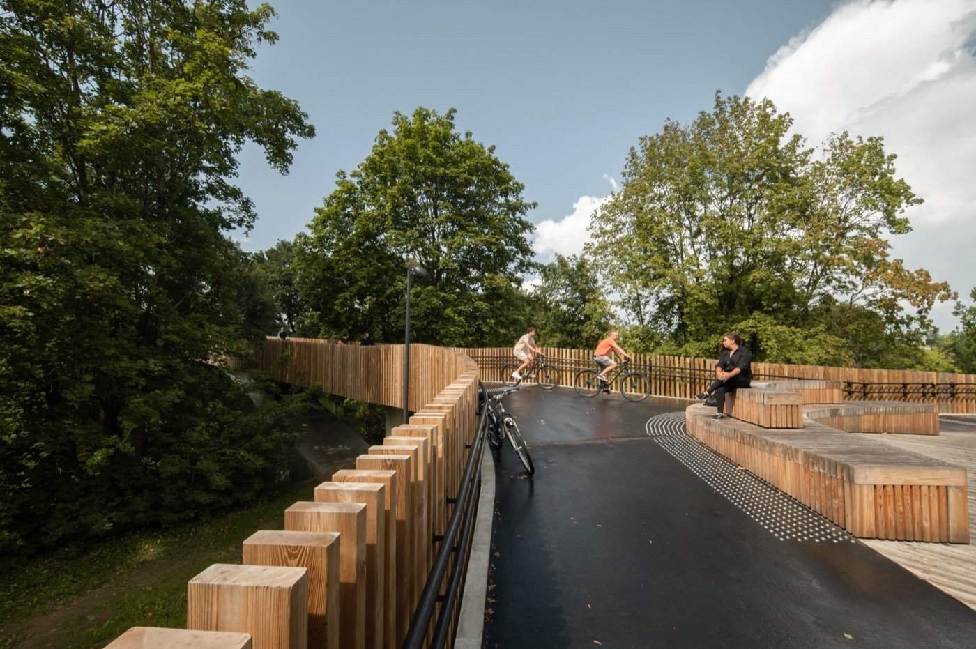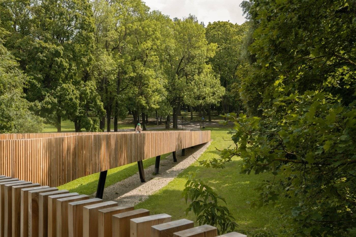 桥梁在公园的新身份中也起着决定性的作用。重建和新建的桥梁都采用了垂直木板的设计。横跨Nevežis河的主桥曾经是轮椅、婴儿车和骑自行车的人无法进入的,现在包括坡道和一个用于休息和观看活动的观察区。溪流上的小桥为斯卡斯卡尔尼斯公园的景观增添了魅力和乐趣。