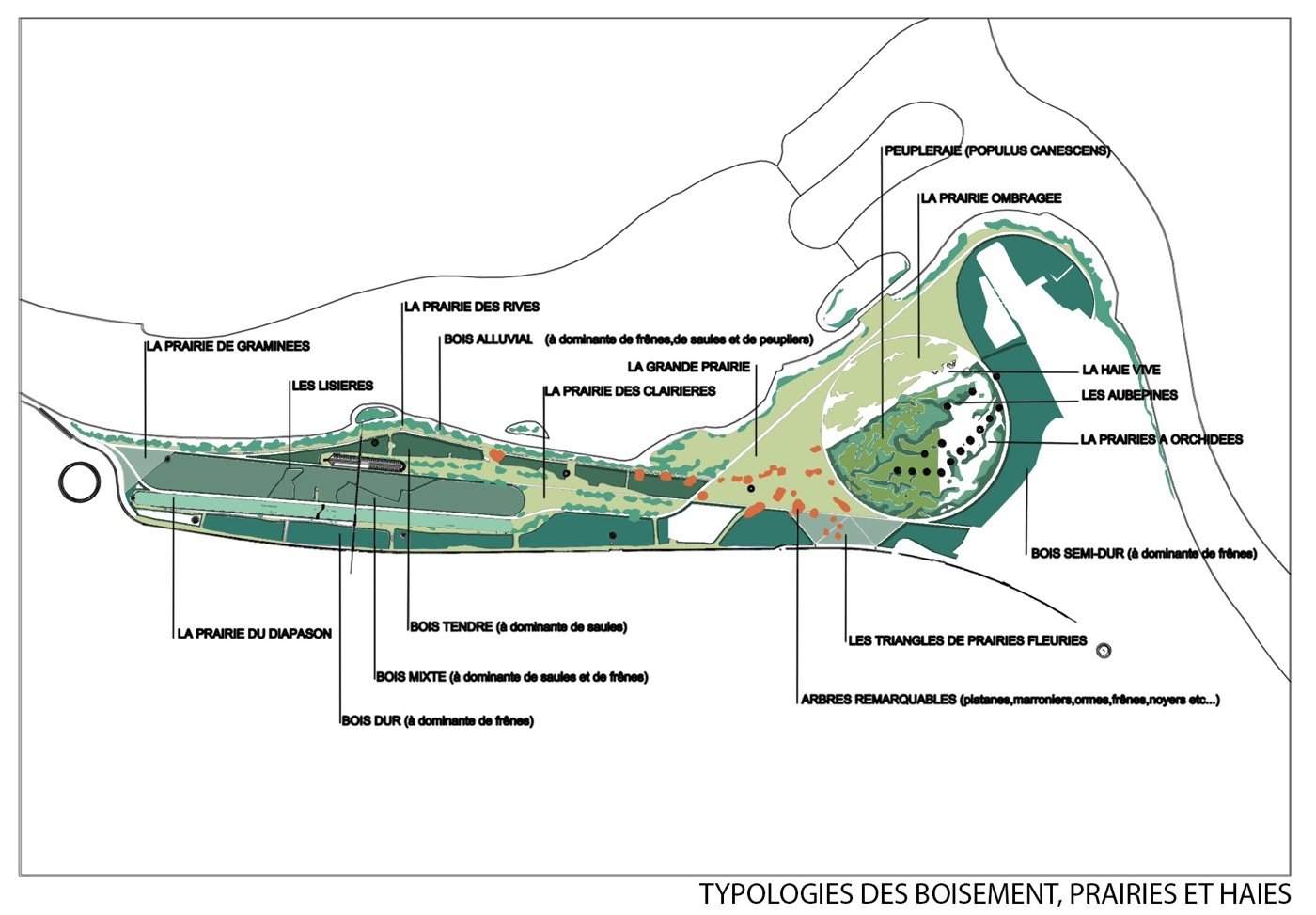In 1999, when the competition was launched, the site was a 45-hectare alluvial brownfield site resulting from the industrial extraction of drinking water for the Lyon urban area, abandoned in the 1970s. The Greater Lyon local authority then redeveloped the peripheric boulevard and created the T1 tramway line adjacent to the site, making it accessible. The alluvial forest could finally be reconsidered as a potential open and important natural piece in the linear landscape of the Rhône’s left bank in the continuity of the historic Parc de la Tête d’Or (117 ha, by Frères Bühler in 1864), Parc de Gerland (100 ha, by Michel Corajoud in 2000), Parc de la Cité Internationale (by Michel Corajoud and Renzo Piano in 2000) and the banks of the Rhône (5 km, by In Situ in 2007).